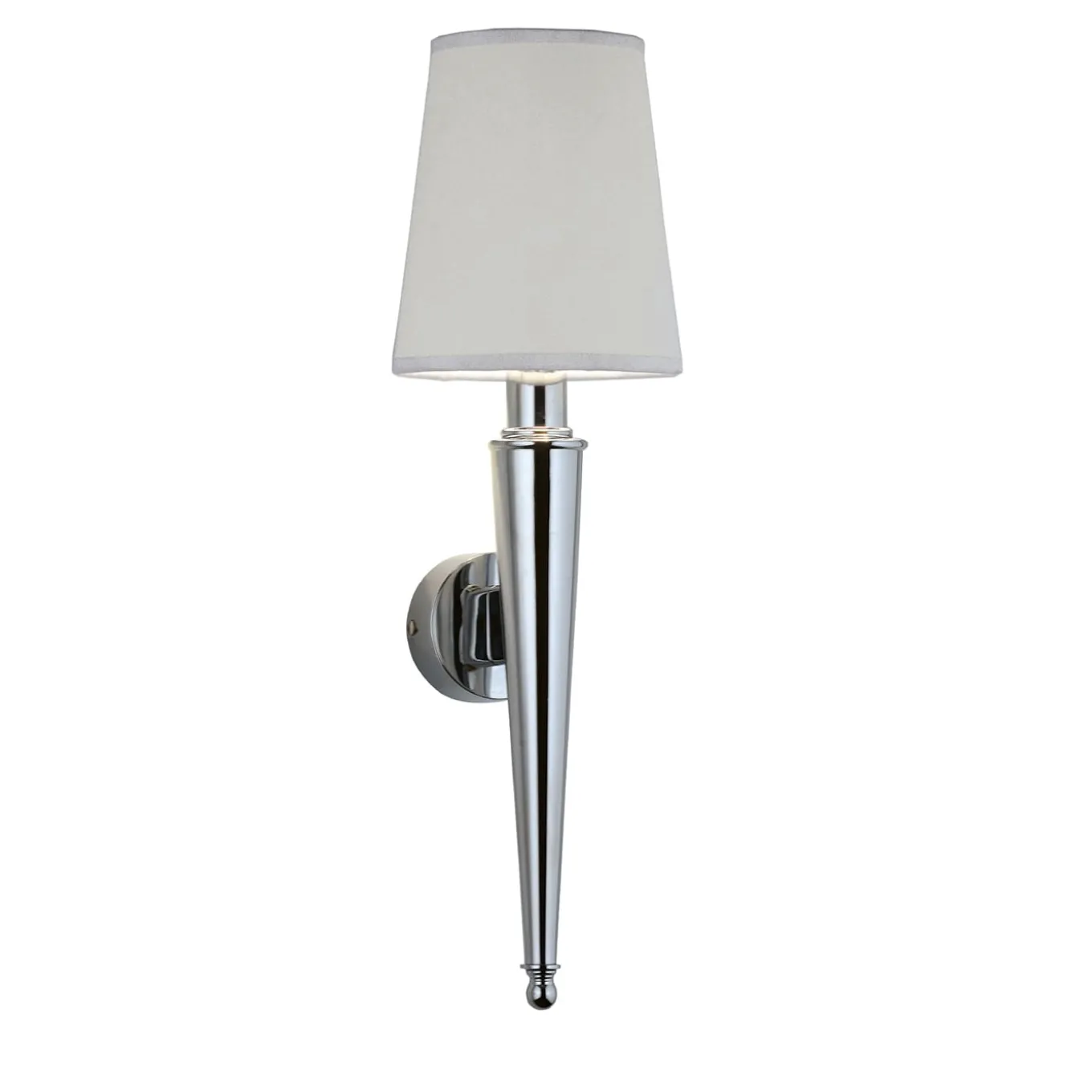 Sleek and refined, this wall lamp will elegantly accent modern decors and increase the illumination level wherever desired, alone or combined with twins. The glistening chrome finish accenting the stiletto-like brass frame is enhanced with the glow radiating from above – housed in a quiet conical fabric shade. Light is emitted by a single E14 LED bulb (40W/230-240V).