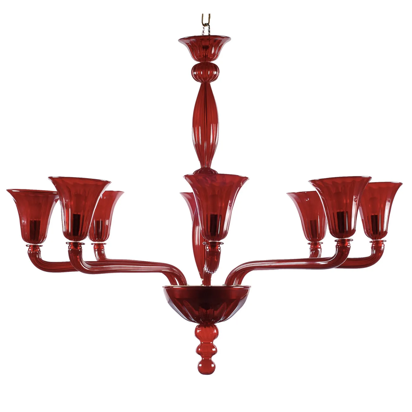 This elegant Murano glass chandelier in the neo-decò style features eight lights attached to elongated arms. The striking red color of this piece will make it stand out in any environment.