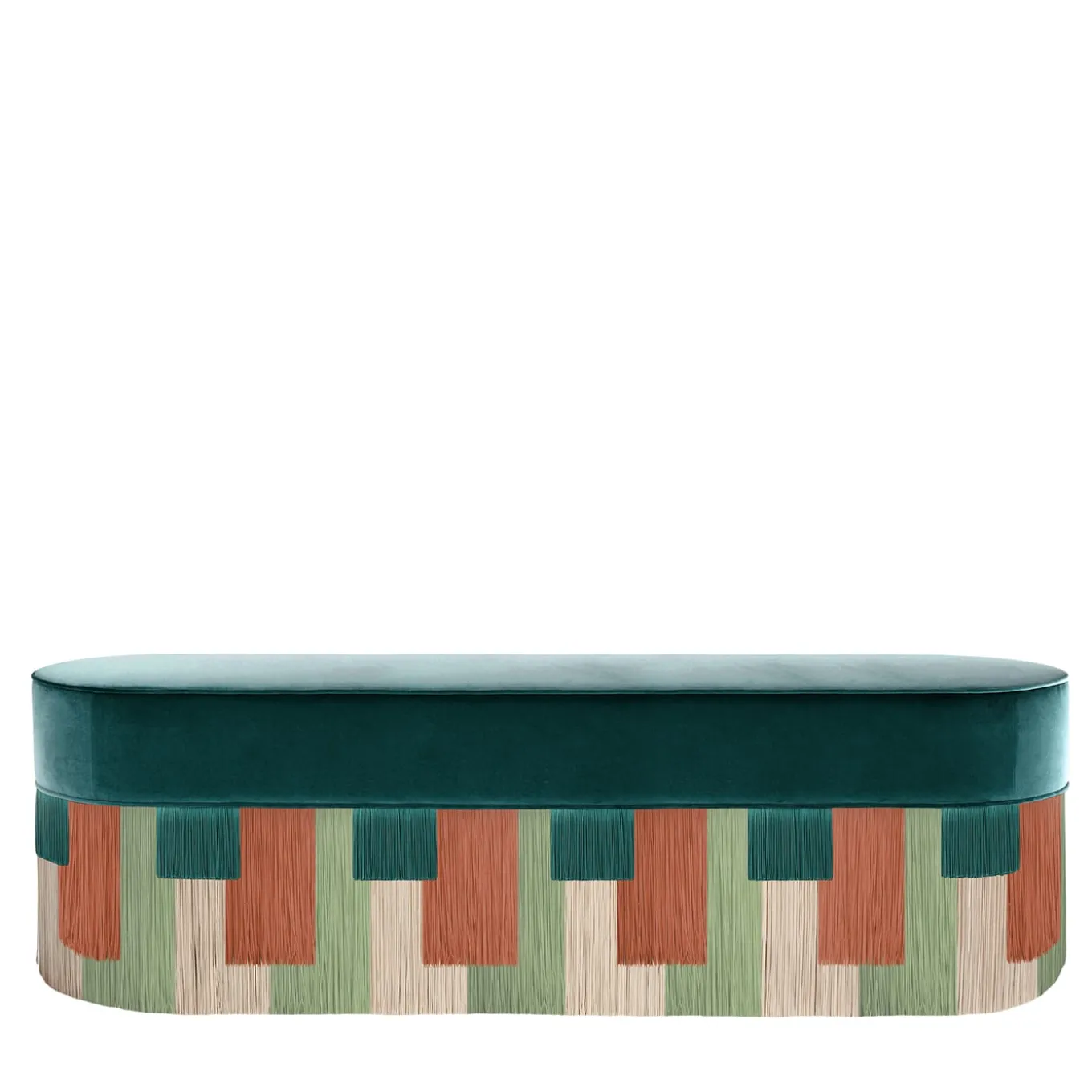 Defined by clean lines and harmonious curves, this stunning artisan bench is a statement-making piece demanding attention in its hypnotizing and colorful geometric design. The pattern, extending throughout the base, is obtained by combining fringes in assorted sizes and hues that descend from a wide seat covered in fine pine-green velvet. Please contact the Concierge for customizations. Each bespoke piece is stamped on the bottom of the pouf’s lining and personally signed, numbered, and dated by designer.