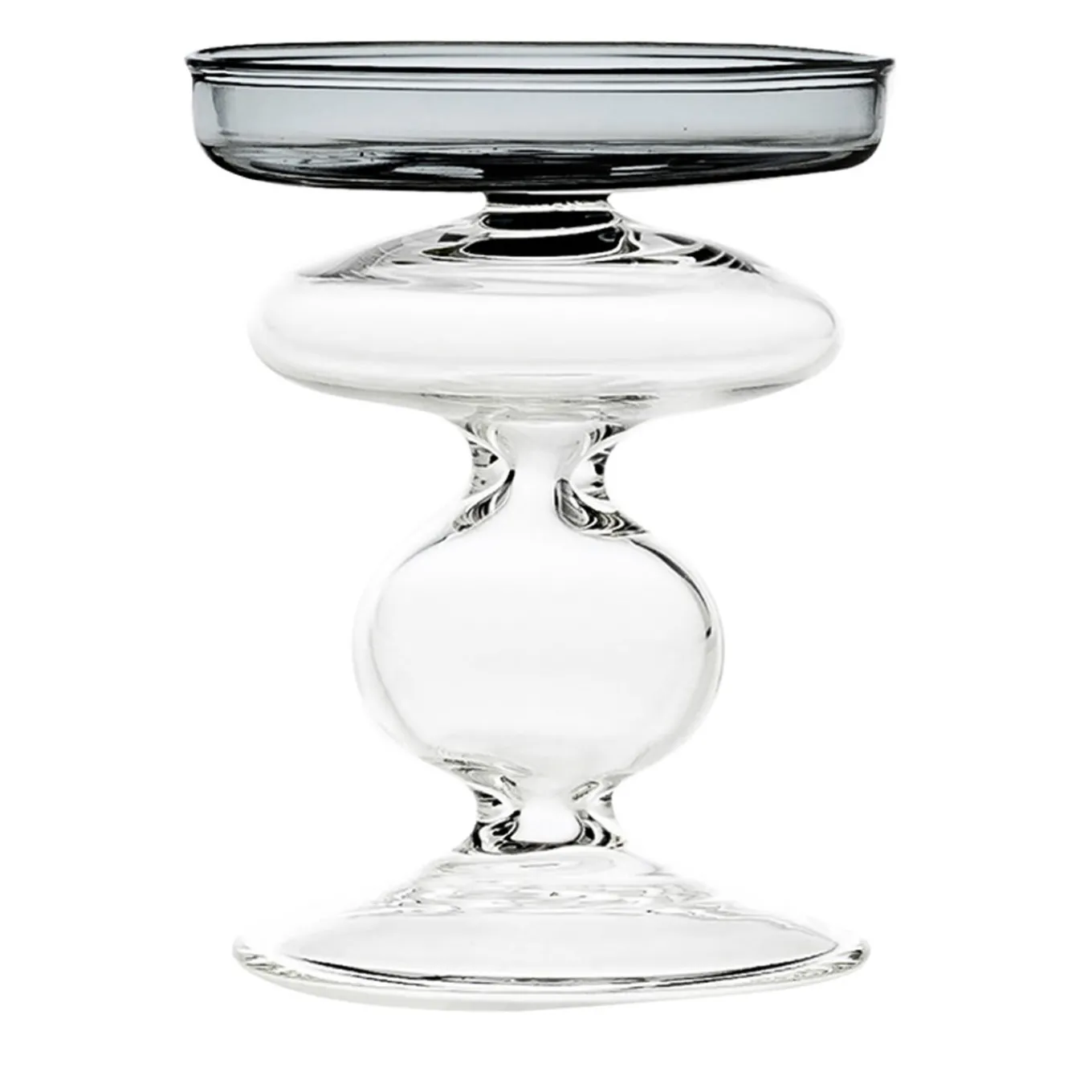 Handcrafted in Venice, this candle holder is made of transparent glass curving mellifluously in fluid forms, while the broad socket takes a dark smoky hue.