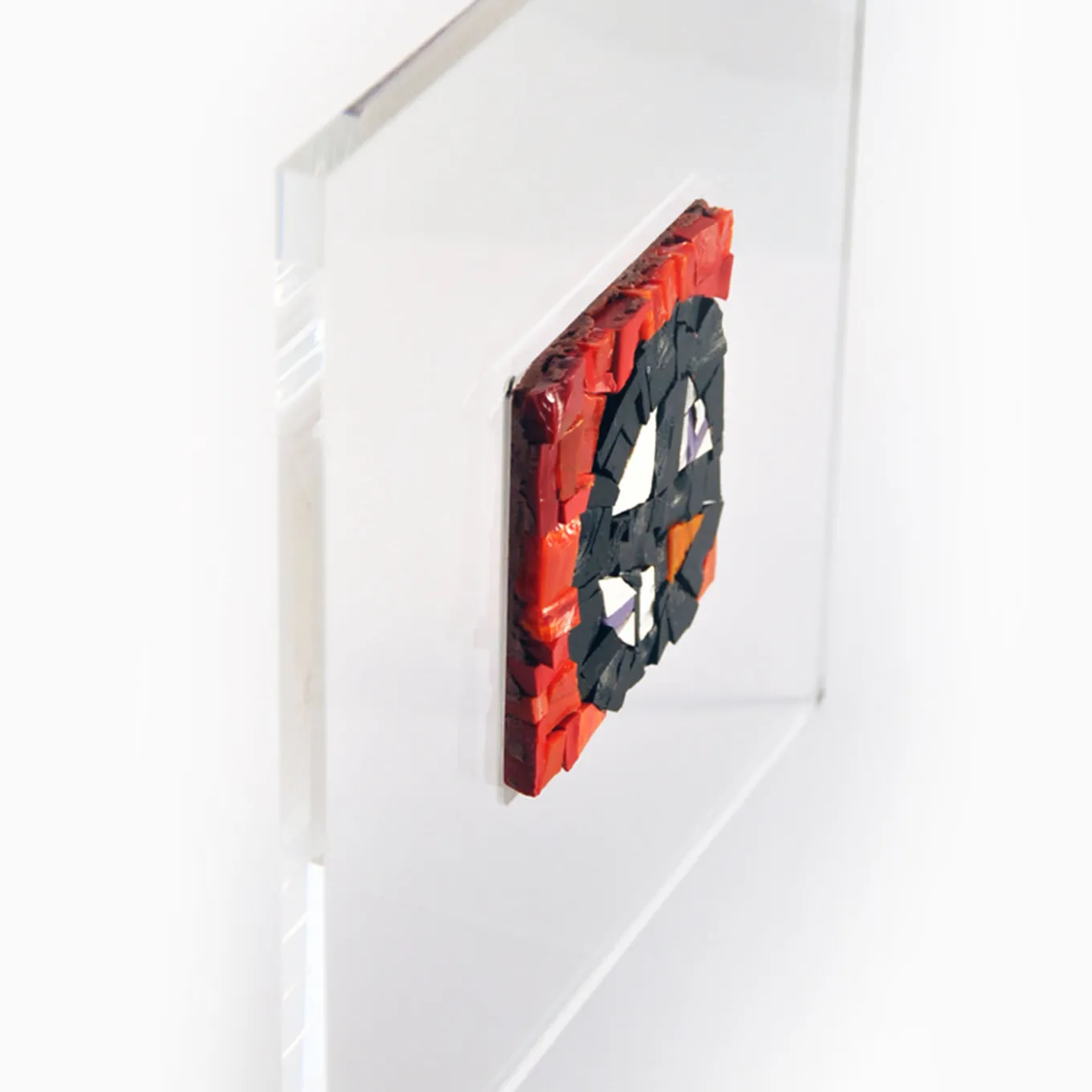 The clean, transparent lines of the crystal acrylic frame of this Nino Basso mosaic tableau enclose in their centre a lively-coloured, handmade geometrical mosaic composed of Venetian enamel. Mosaics have fascinated humans for centuries, and this modern re-creation is sure to make an impression as a decorative piece in any contemporary setting.