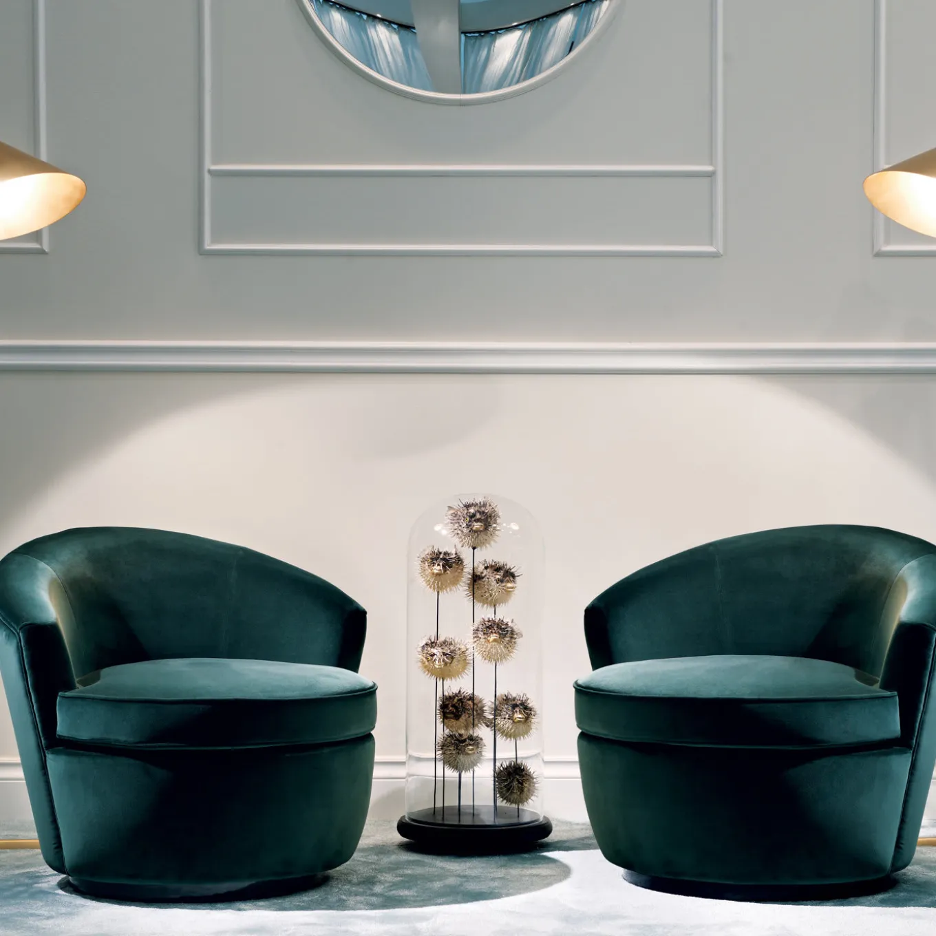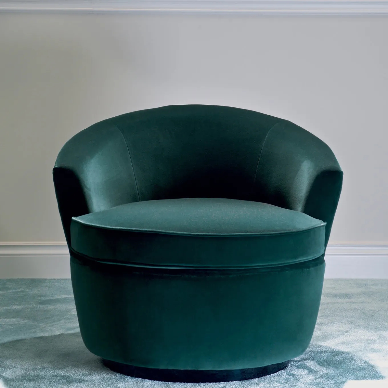 An ideal addition to a modern decor, this armchair can be displayed in private homes and commercial spaces alike, imbuing any room with sophisticated allure. The comfortable and timeless silhouette of this piece comprises a thick round seat (40 cm high) that sits on a plinth base in black glossy lacquered wood. The standout element of this chair is its enveloping backrest. The entire piece is upholstered in a peacock blue fabric (Cat 3). The cover is not removable.