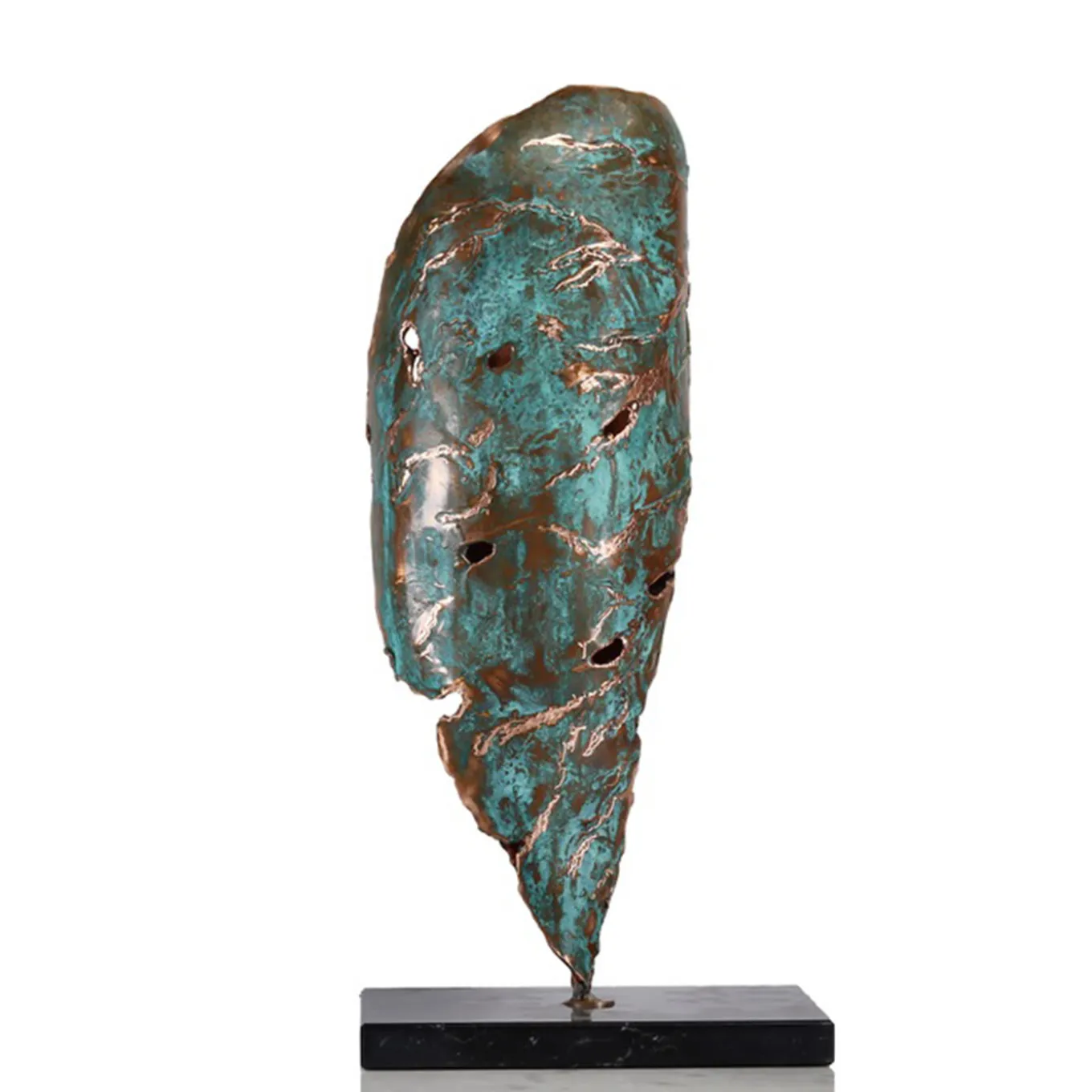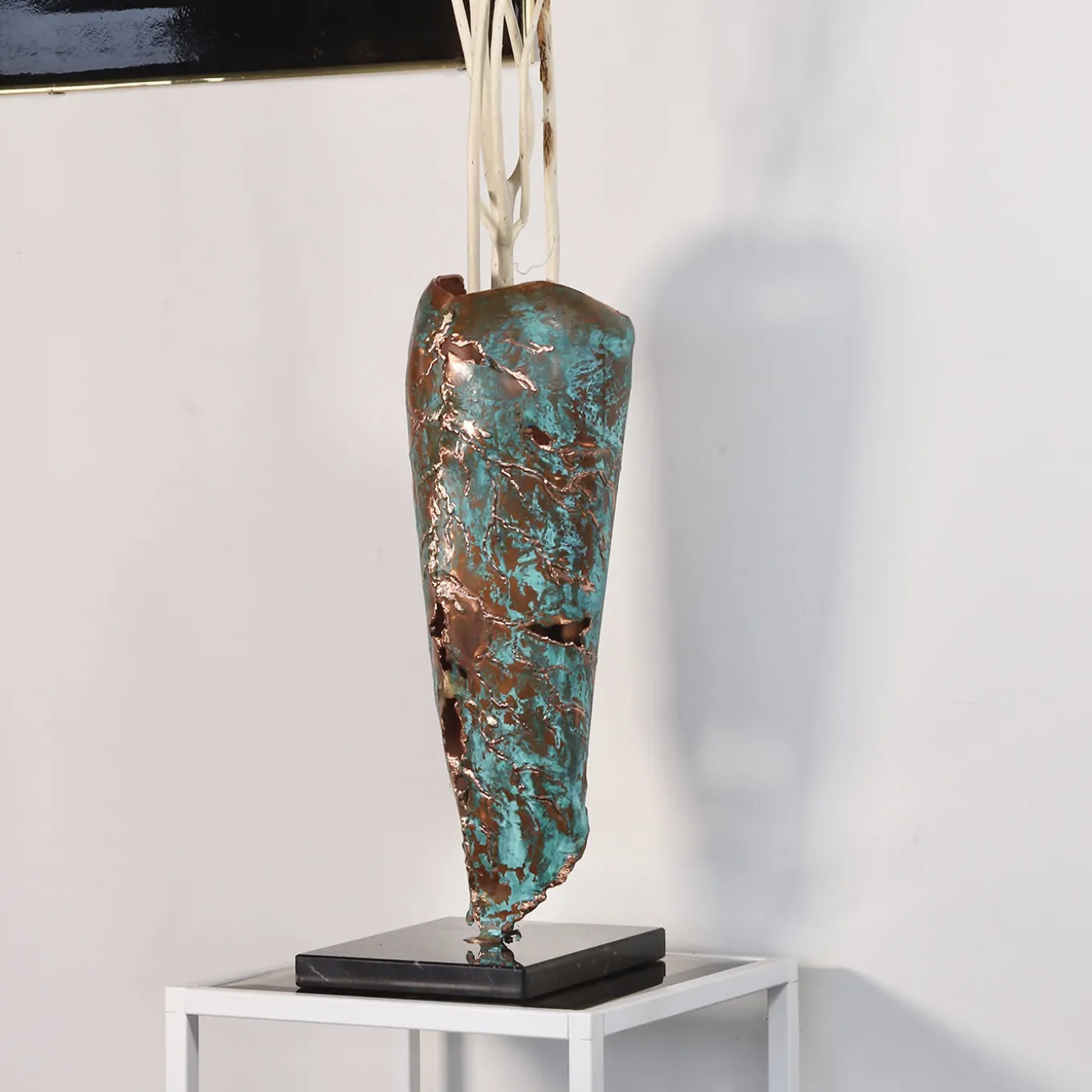 A new bud peeks out from under a pile of fallen leaves. The life cycle of nature continues on, in all its magnificent colors. This statue is made with recycled copper that is worked by hand and completed with natural treatments to bring out the green tone. A sustainable piece, made entirely by hand.