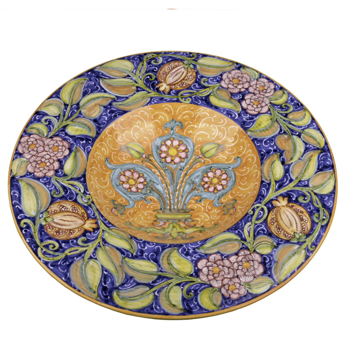 Imbuing any classic or traditional decor with a colorful and exquisite decorative accent, this plate can be displayed on a cabinet or wall, creating a superb decoration in an entryway or dining room. This mesmerizing design was created by Lorenza Adami and was inspired by the paintings of her grandfather, Tito Chini. At the center is a lily, symbol of the city of Florence, depicted in turquoise, contrasting with the yellow background and enclosed in a thick, triumphant garland of fruits and flowers. The piece is equipped with a iron hook for easy hanging.