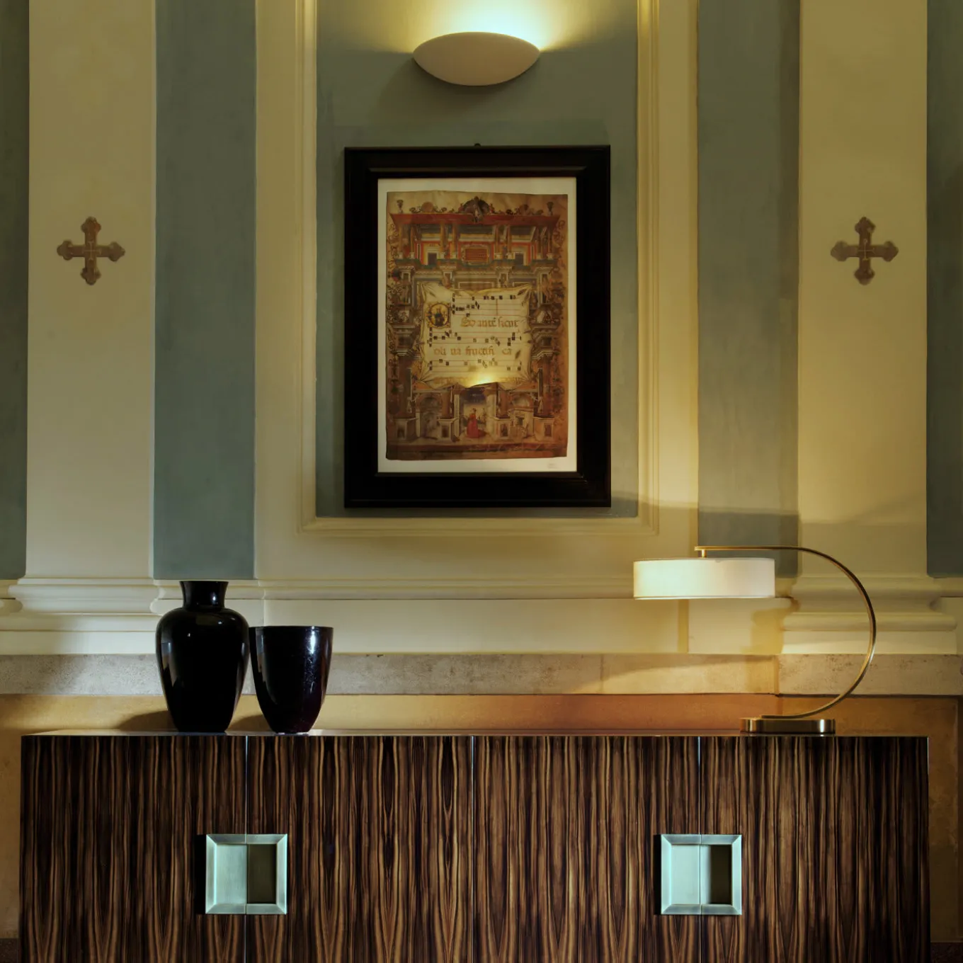 A sophisticated accent and elegant storage, this sideboard is part of the Gilbert series and can be used to create a unique decoration in an entryway, living room, or dining room, also adding generous space for a variety of objects. The structure in wood is finished with prized Macassar ebony veneer on the four front panels of the doors, opening up into four compartments, each divided by an internal shelf. The handles in metal with a galvanic finish complete the design. Either alone or paired with the Gilbert Tall Cabinet, this piece will be eye-catching and functional.
