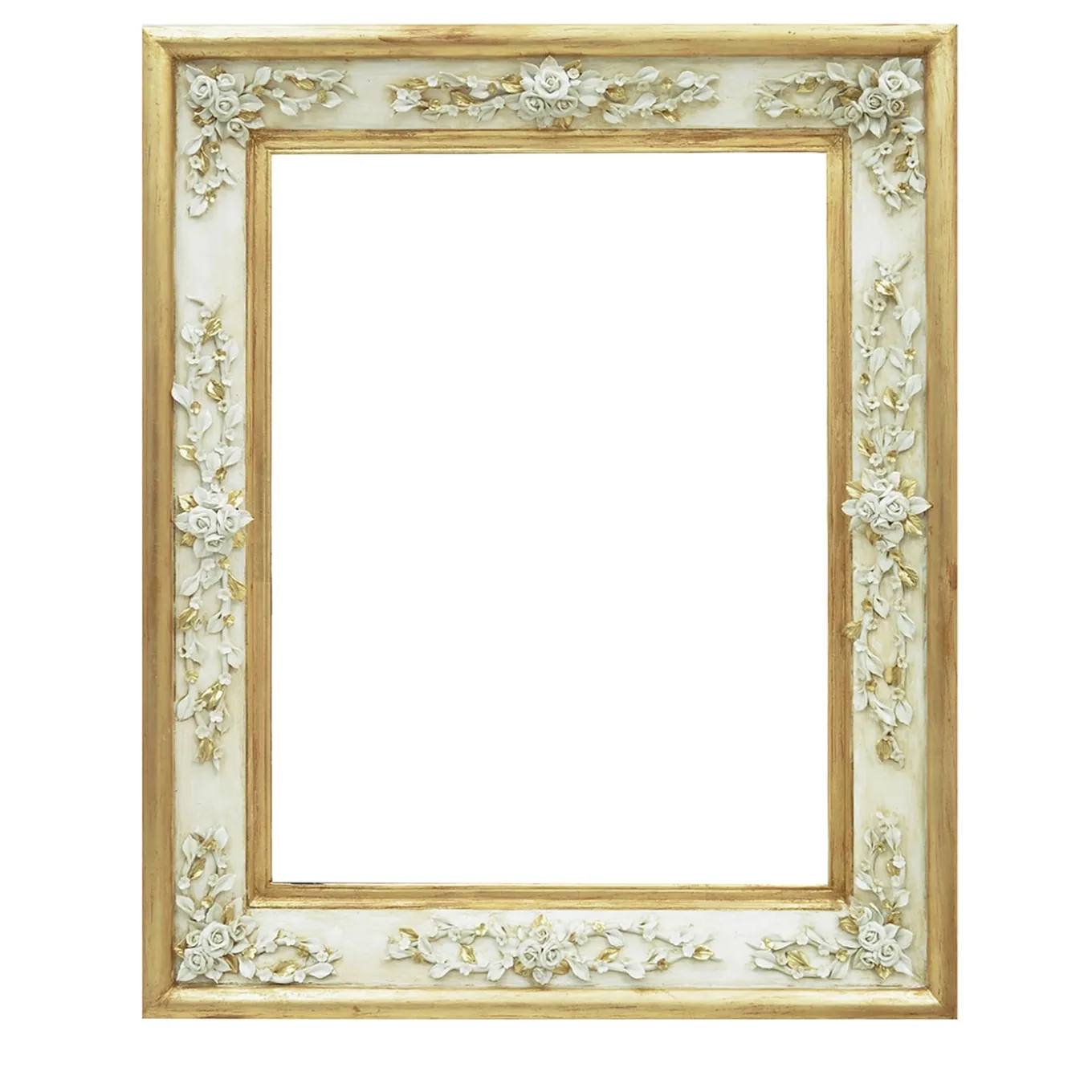 Patinated gold-leaf gilded wooden frame, lacquered in porcelain color and with applications of roses and buds in Capodimonte porcelain painted with third-fired pure gold. Interior measurements cm.80×60. Please, contact the Concierge service for further information.