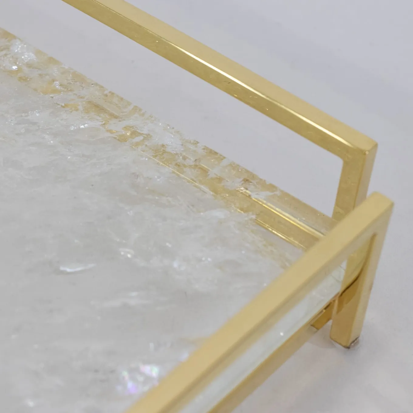 Quiet in its size as it is refined in its aesthetic, this sublime vide-poche will enrich modern desks or side tables with a dash of opulence. The preciousness of the gilded finish illuminating all the linear profiles of its brass frame meets the one of the hyaline quartz sheet, which enchants with its traceries and transparencies.