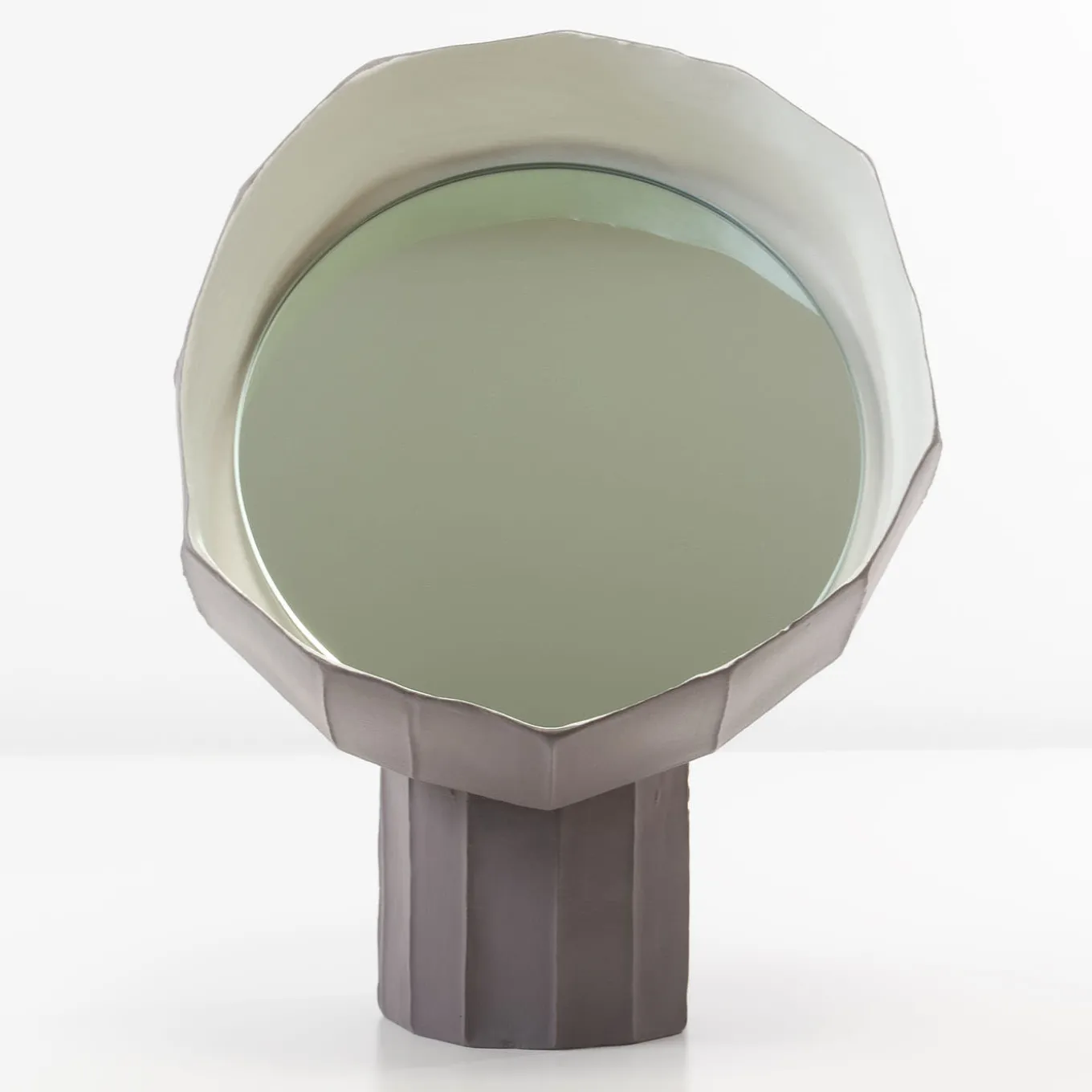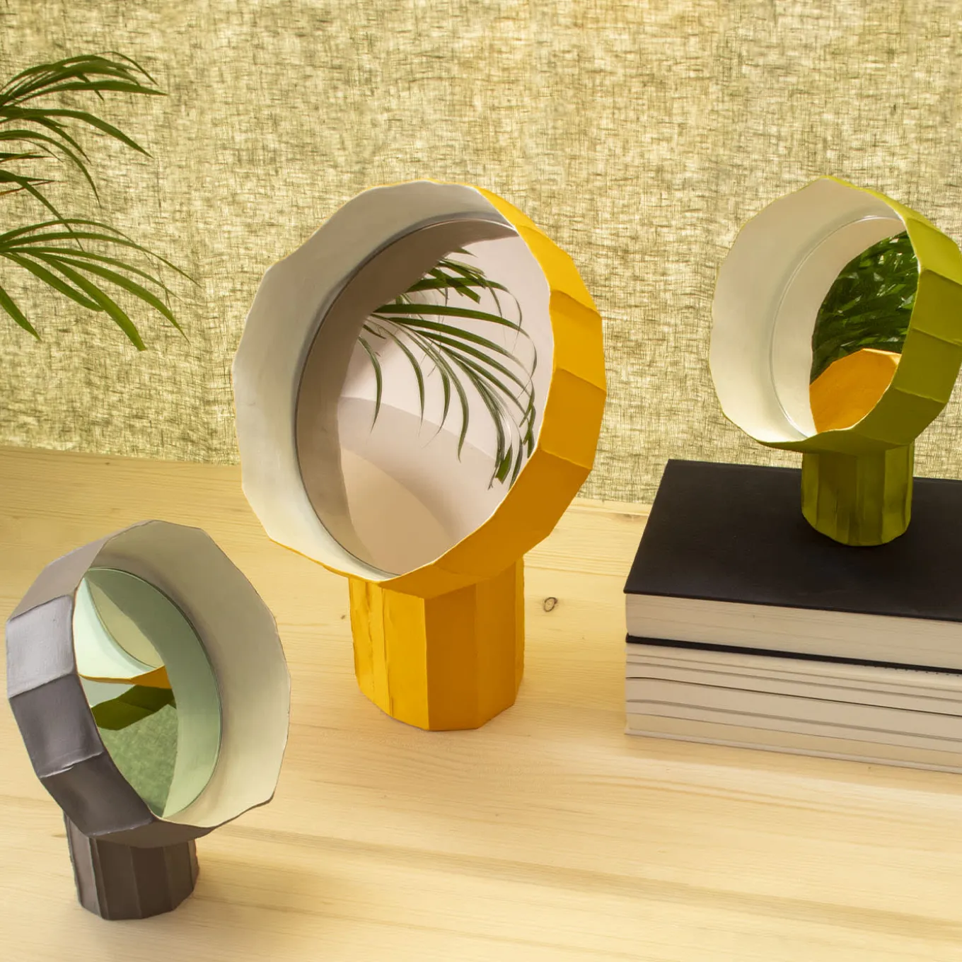Compact and sculptural in its slightly faceted paper clay silhouette, this table mirror was designed by Paola Paronetto and Giovanni Botticelli with sunflowers in mind. Resulting meaningfully lifted for evoking a sunflower following the sun, the corolla-like element welcomes the mirrored glass insert. Every piece flaunts deliberate irregularities attesting to its precious artisan quality.