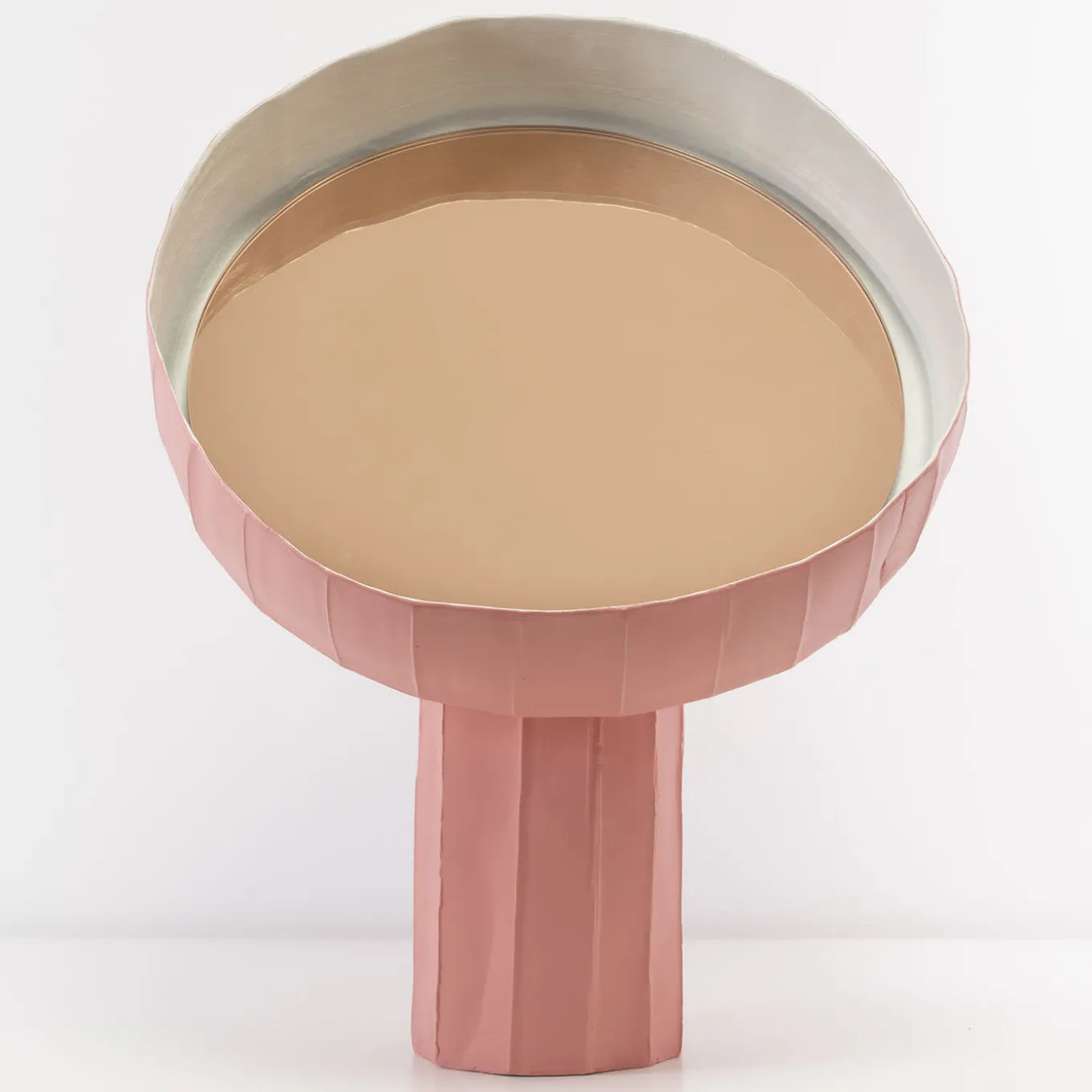 Part of the Reflections Collection by designers Paola Paronetto and Giovanni Botticelli, this table mirror sports an original silhouette inspired by sunflowers. A subtly faceted texture marks the pink paper clay structure, its corolla-like element welcoming a golden-toned mirrored glass insert oriented upwards for underlining the piece’s decorative flair.