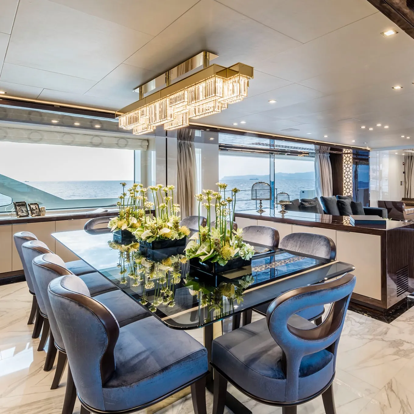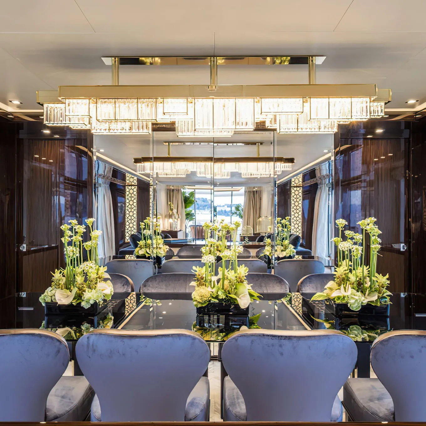 Crystals and a chrome plating are combined together to give emphasis to a geometrical and complex system, composed of modular elements. Gisele lamp offers multiple declinations, like a choreography of bodies in space. An innovative design inspired by art dèco, which combines new technology with aesthetic reasons: the entire structure is created in steel with a laser-cut and the lights are dimmable leds. Led chandelier, led stick 24VDC – 120W, 3000°K supplied, dimmer wifi included.