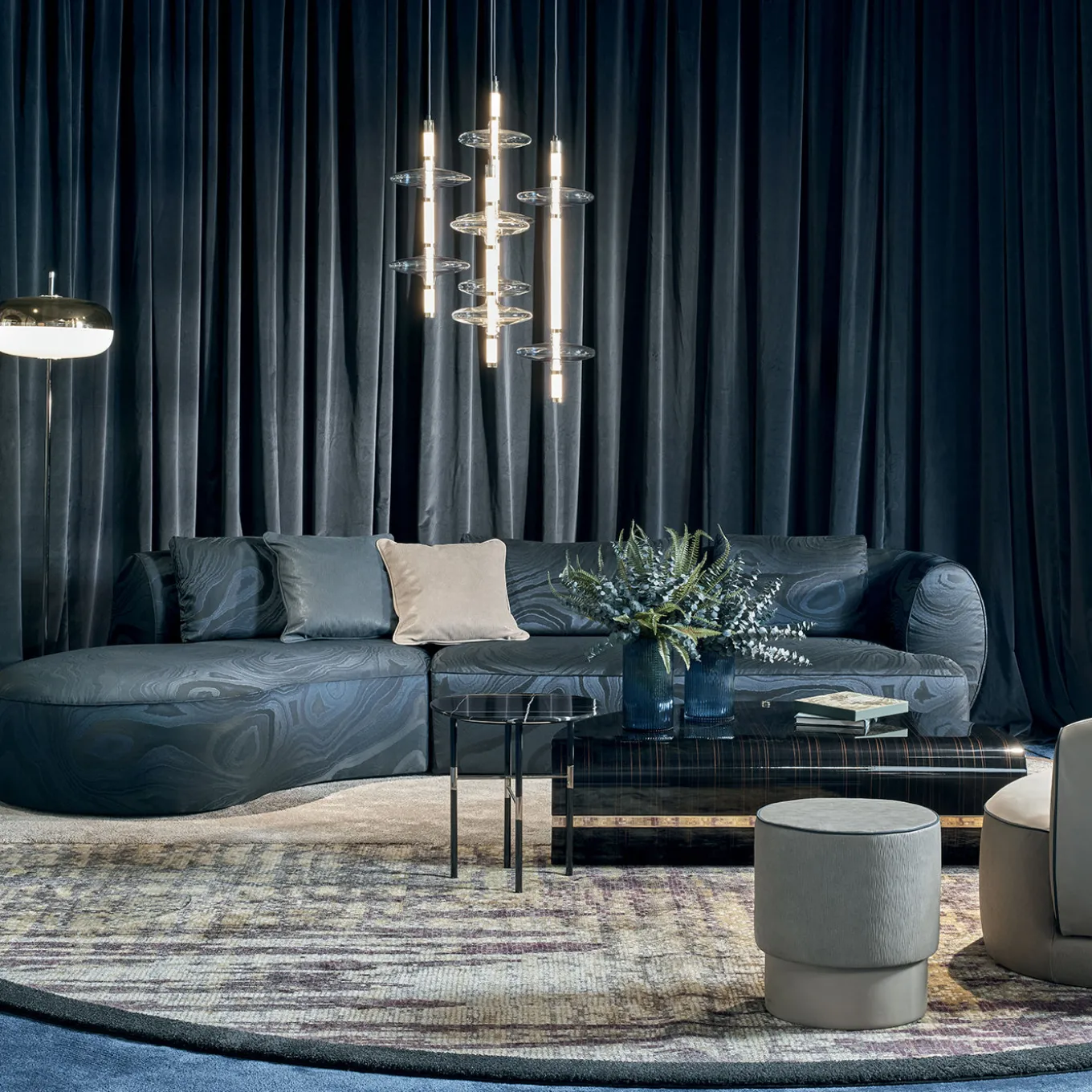 The Giunco CL02 slim glass pendant lamp features a refined slender design with three transparent blown glass diffusers arranged vertically, accented by metal elements with polished finishes. It emits a soft, elegant glow, lending sophistication and subtle ambiance to contemporary interiors. The lamp’s minimal profile allows it to complement various spaces without overwhelming the decor.