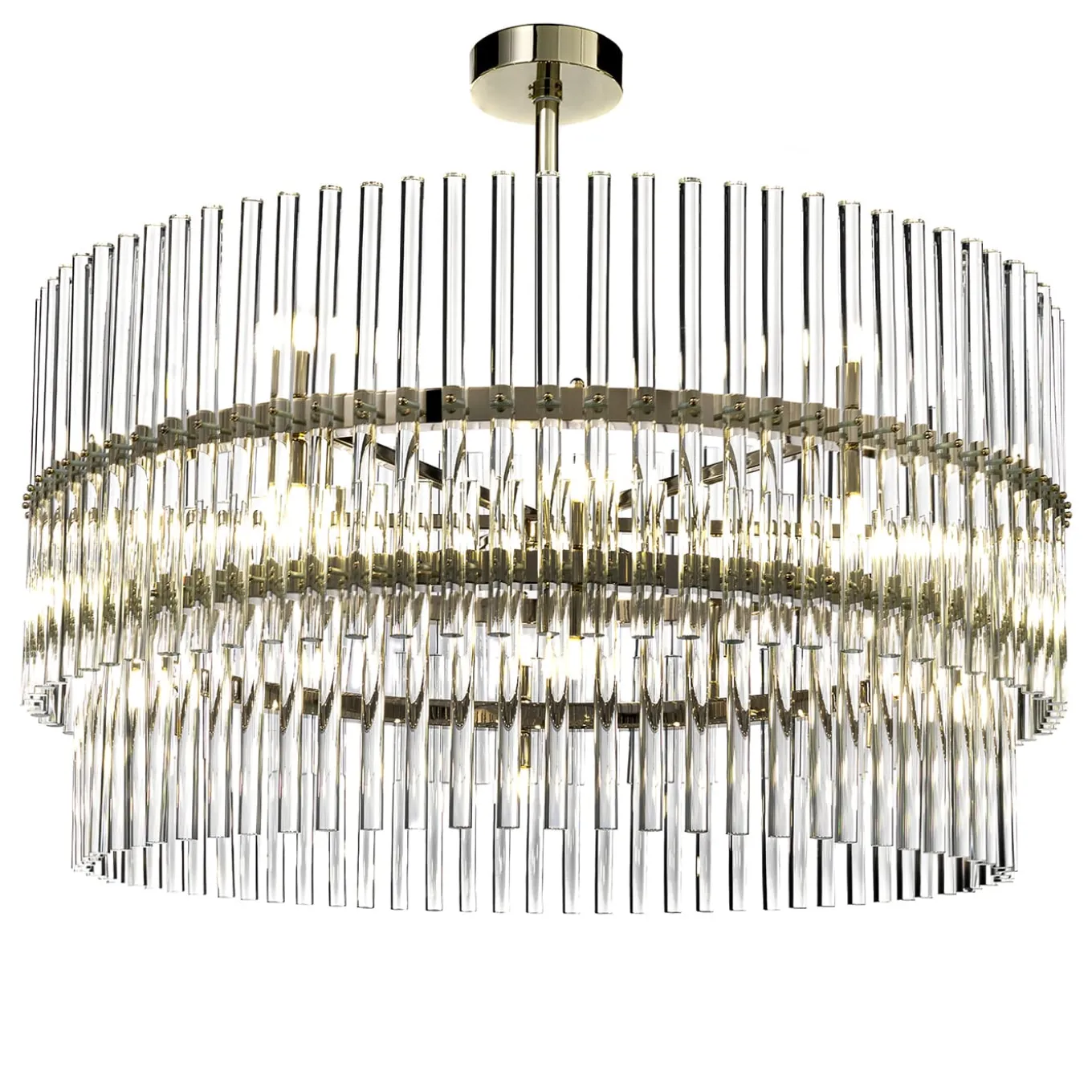 A majestic addition to a luxe modern living or bedrooms, this superb chandelier will set a mesmerizing ambiance in the surroundings thanks to the breath-taking reflections and refractions of the light radiating from twenty-four G9 bulbs and hitting the tiers of clear glass cylinders. The glistening finish of soft gold given to the minimalist brass structure adds further opulence to the design.