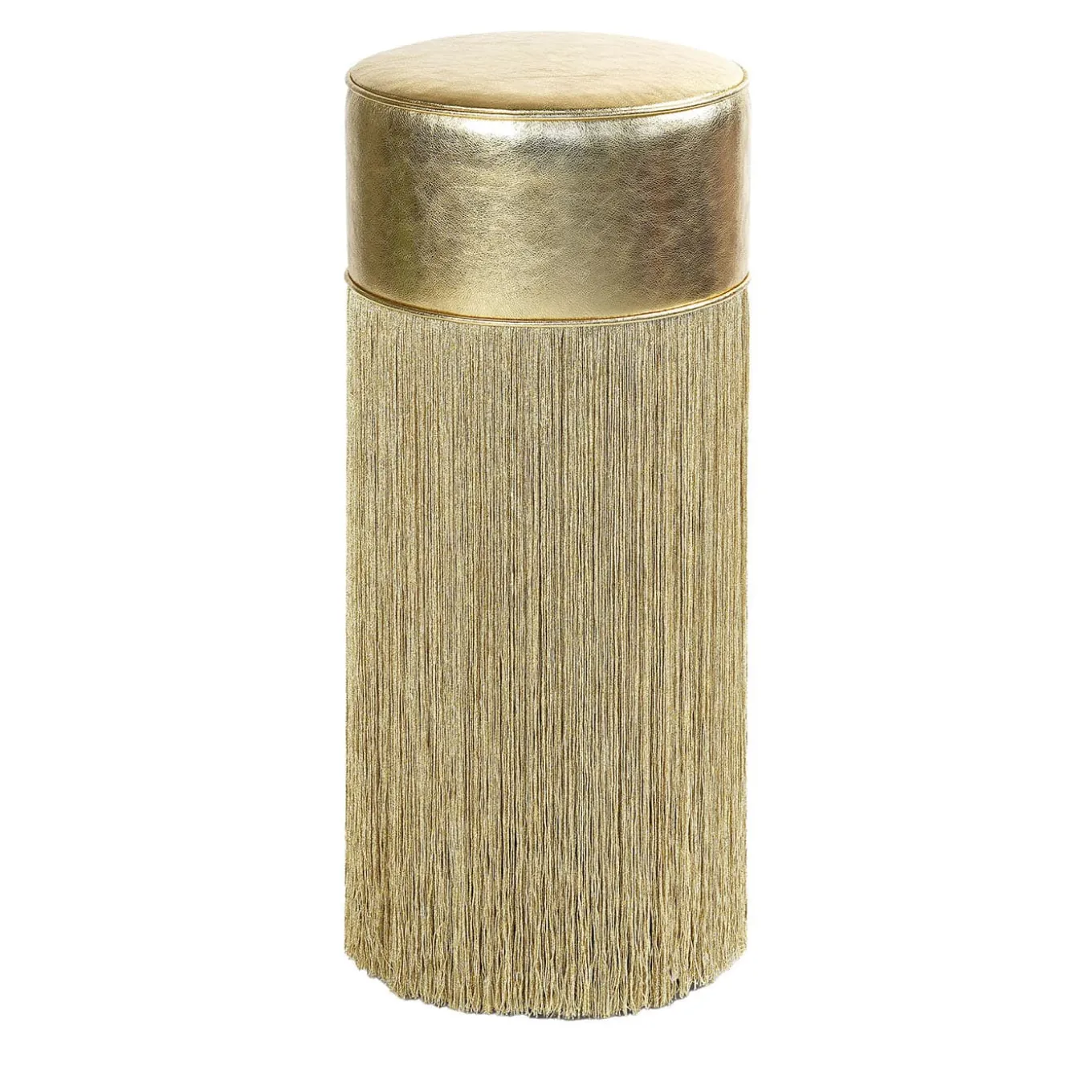 The bar stools from Glistening collection cast a radiant glow, elevating any ambience and unleashing a combined feeling of novelty and extravagance. The iconic fringes are proposed in gold. Upon request any of the characteristic fringe designs can be selected to complement the beaming seating. The Gleaming collection it’s a fusion of futuristic luxury and timeless creating a balance between classic elegance and avant-garde aesthetics. Each bespoke piece is stamped on the bottom of the pouf’s lining and personally signed, numbered, and dated by designer.