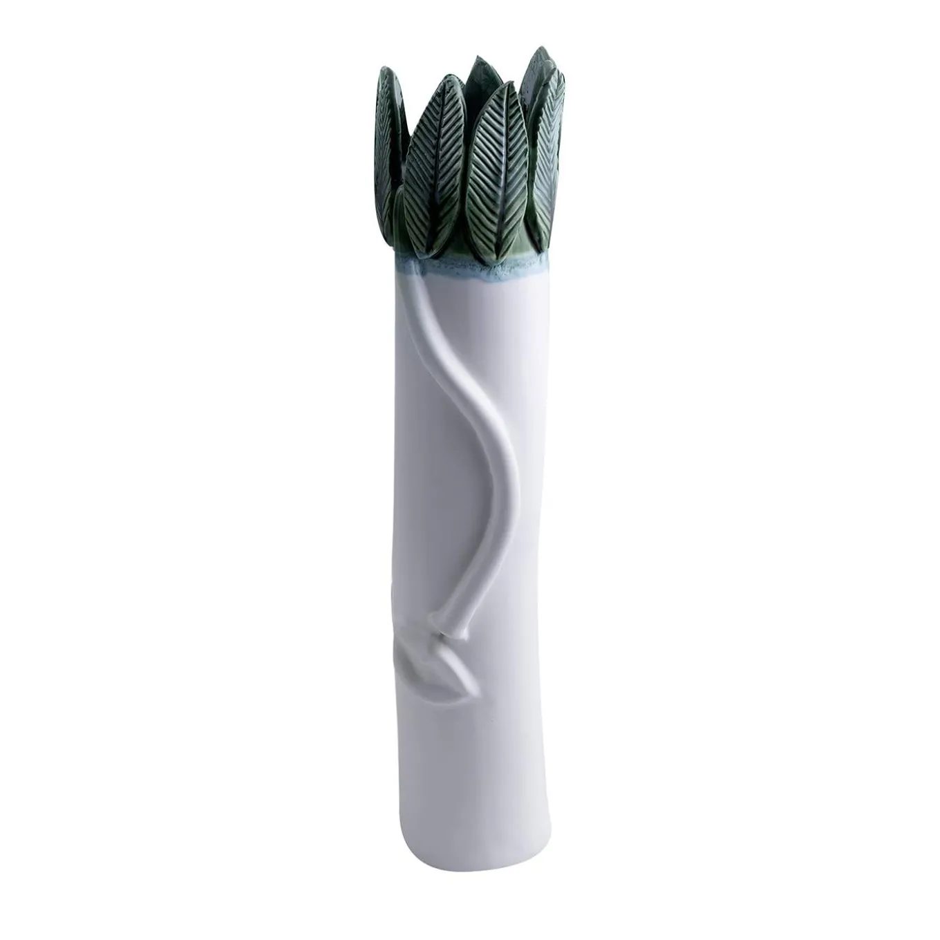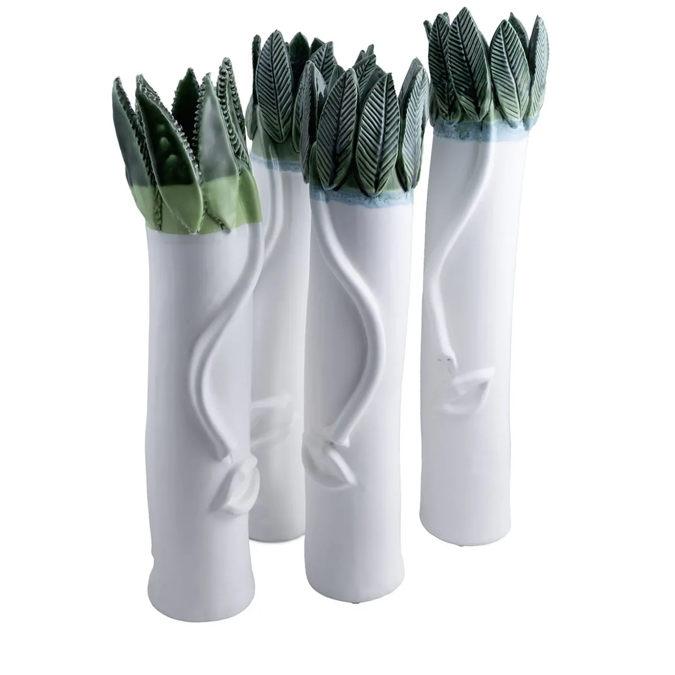 A captivating tall vase, part of “The Talking Trees” series, featuring embossed leaves and an expressive talking face. Crafted with exquisite detail, it combines an iridescent glossy crystalline green and matte white enamel finish. This unique piece brings nature and storytelling into harmony, making it a striking conversation starter in any space.
