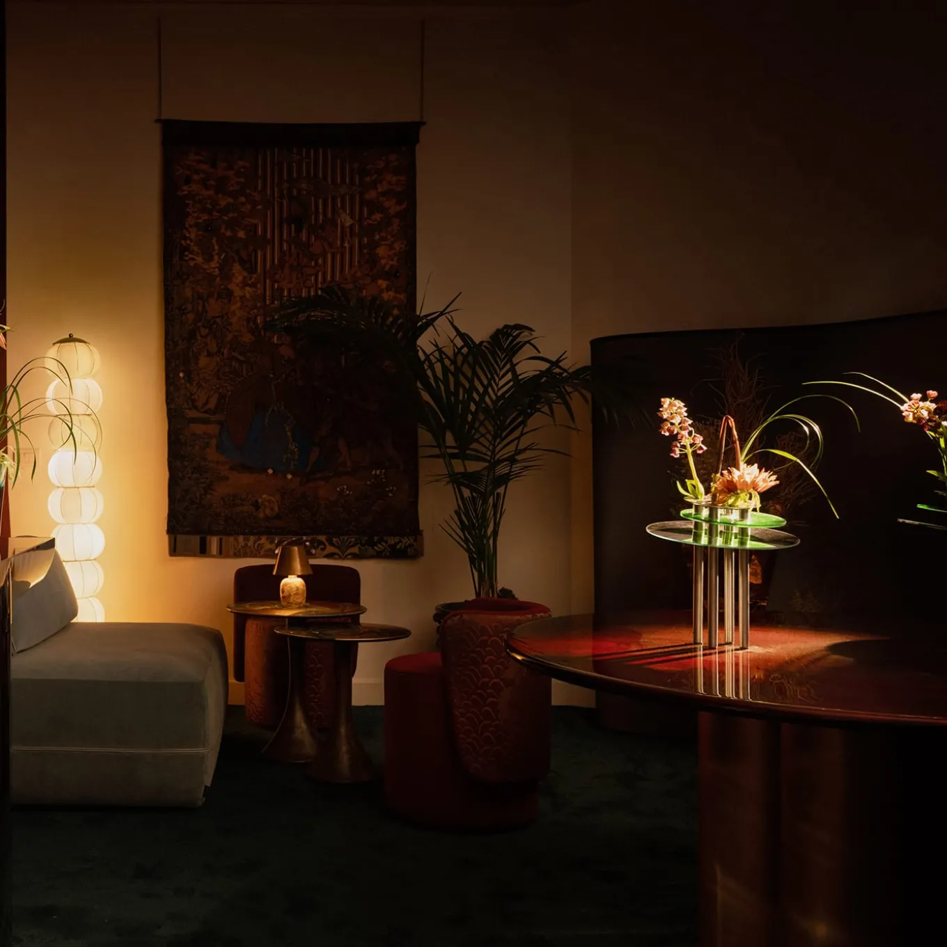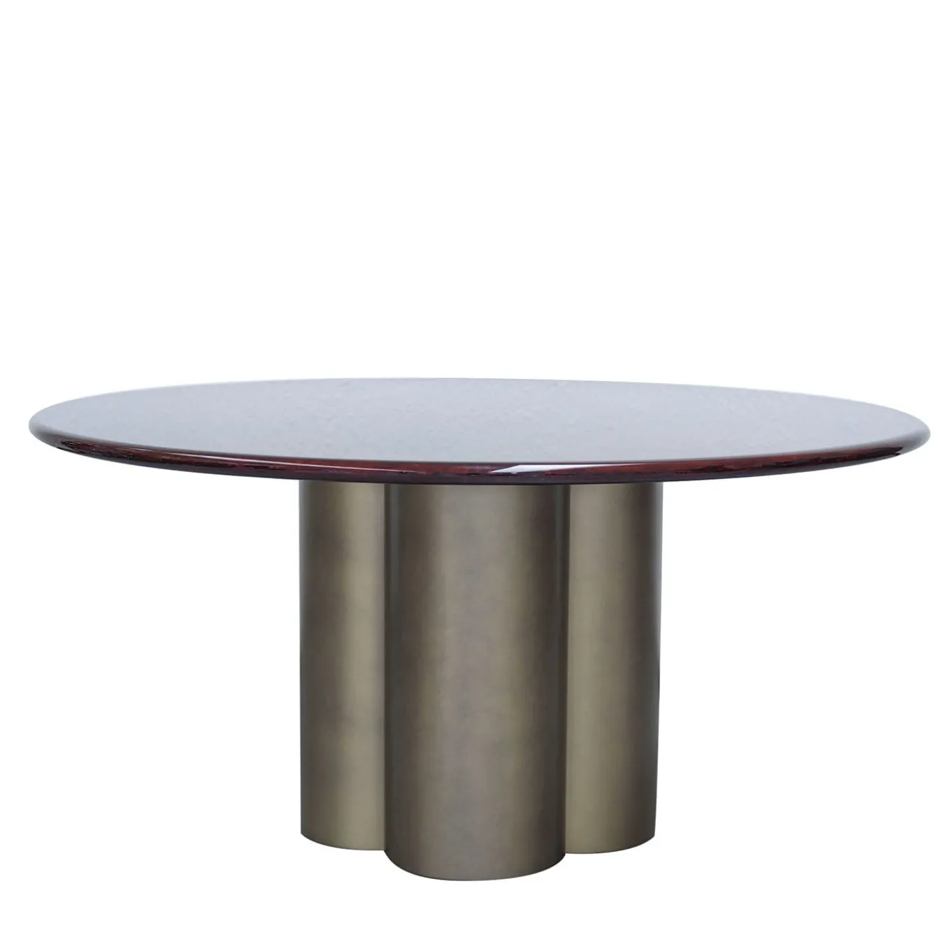 A sophisticated design that expresses the clean refinement of contemporary style, this round table is distinguished by a wooden top covered with Amaranto-colored goatskin, enhanced with a glossy finish. It rests on a quatrefoil-shaped base, also made of wood and lacquered in a bronze shade. This piece is unique. Please consult the Concierge for further information.