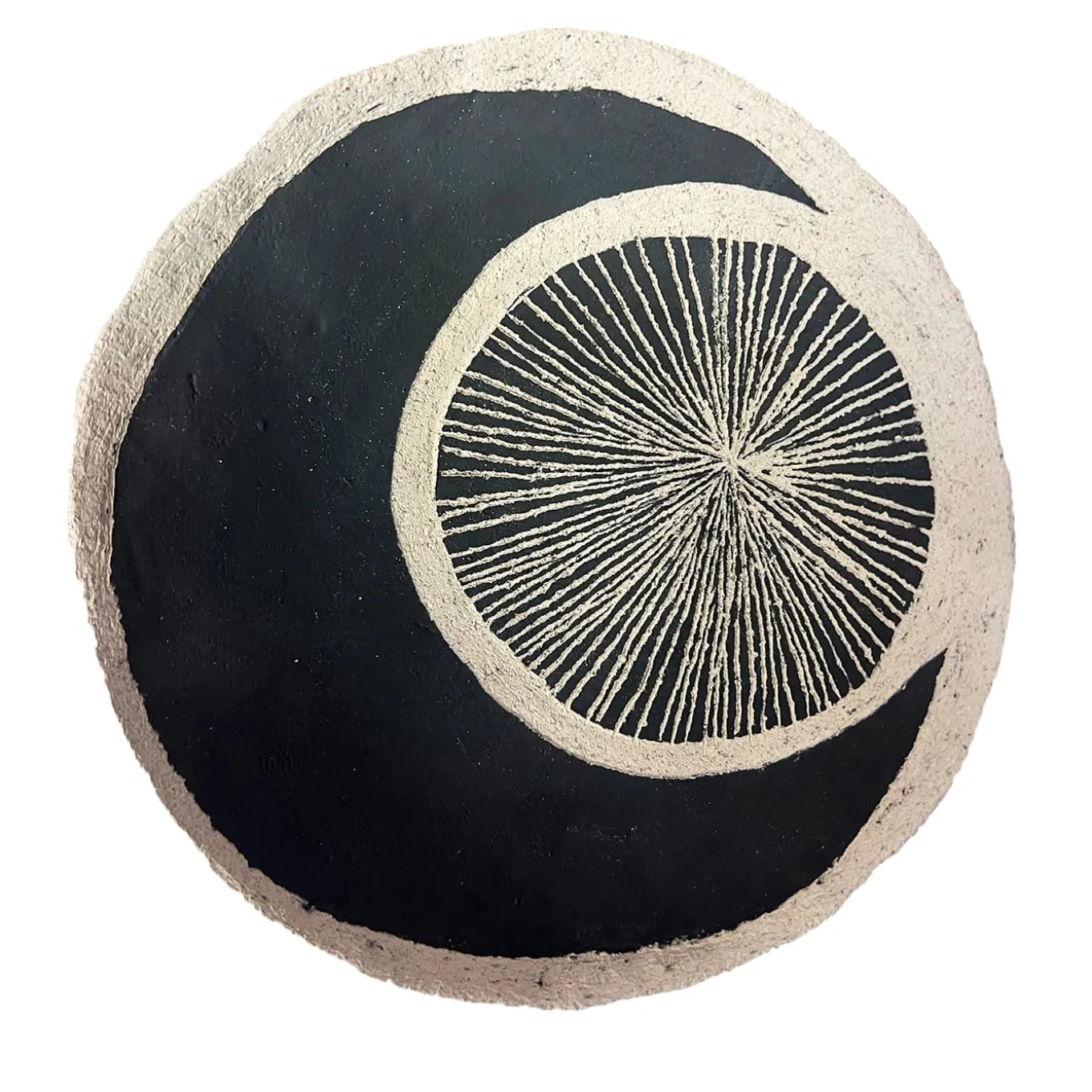 A mesmerizing circular engraving radiates from the center, forming an intricate sunburst pattern against the deep black ceramic. This hand-painted and carved bowl is sculptural and functional, serving as a decorative accent or a refined catchall for everyday essentials. Its textured contrast and handmade imperfections celebrate the beauty of craftsmanship, making it an elegant and unique addition to any curated interior.