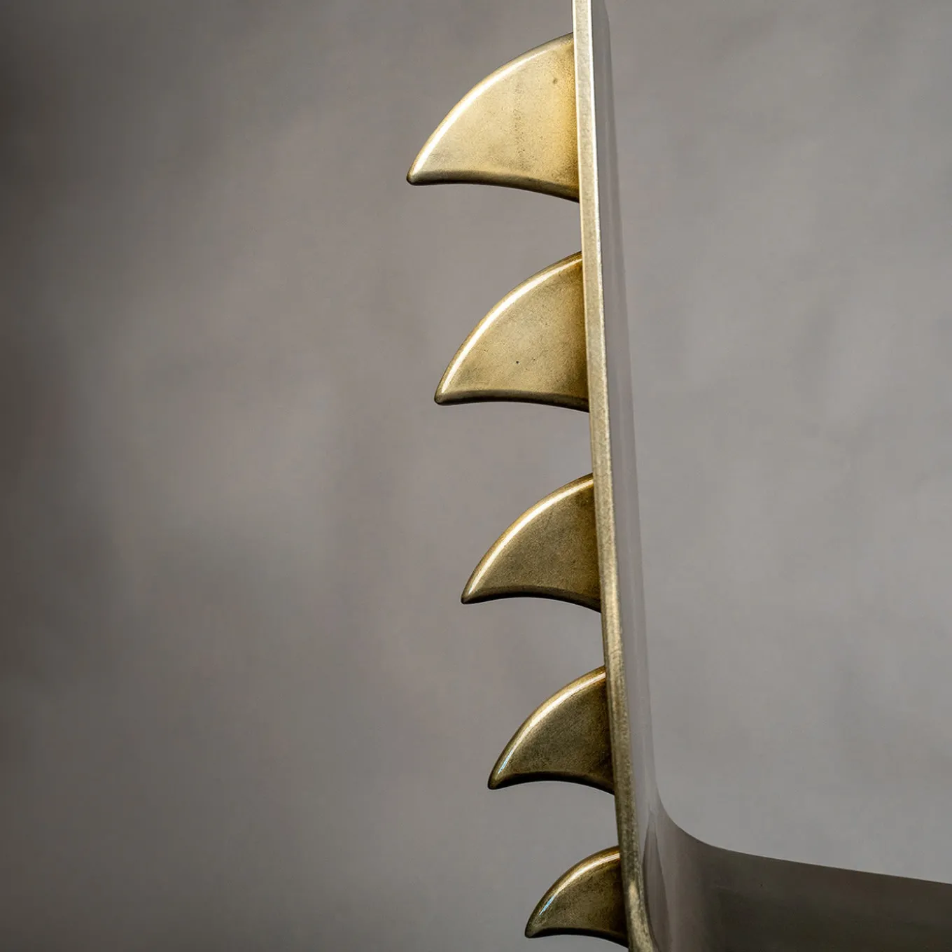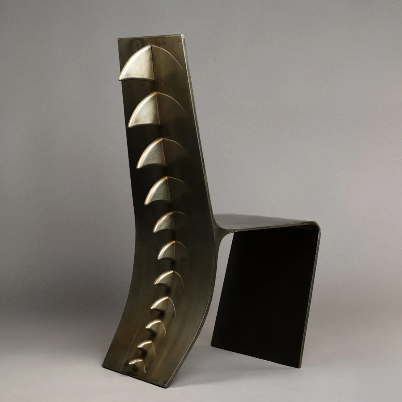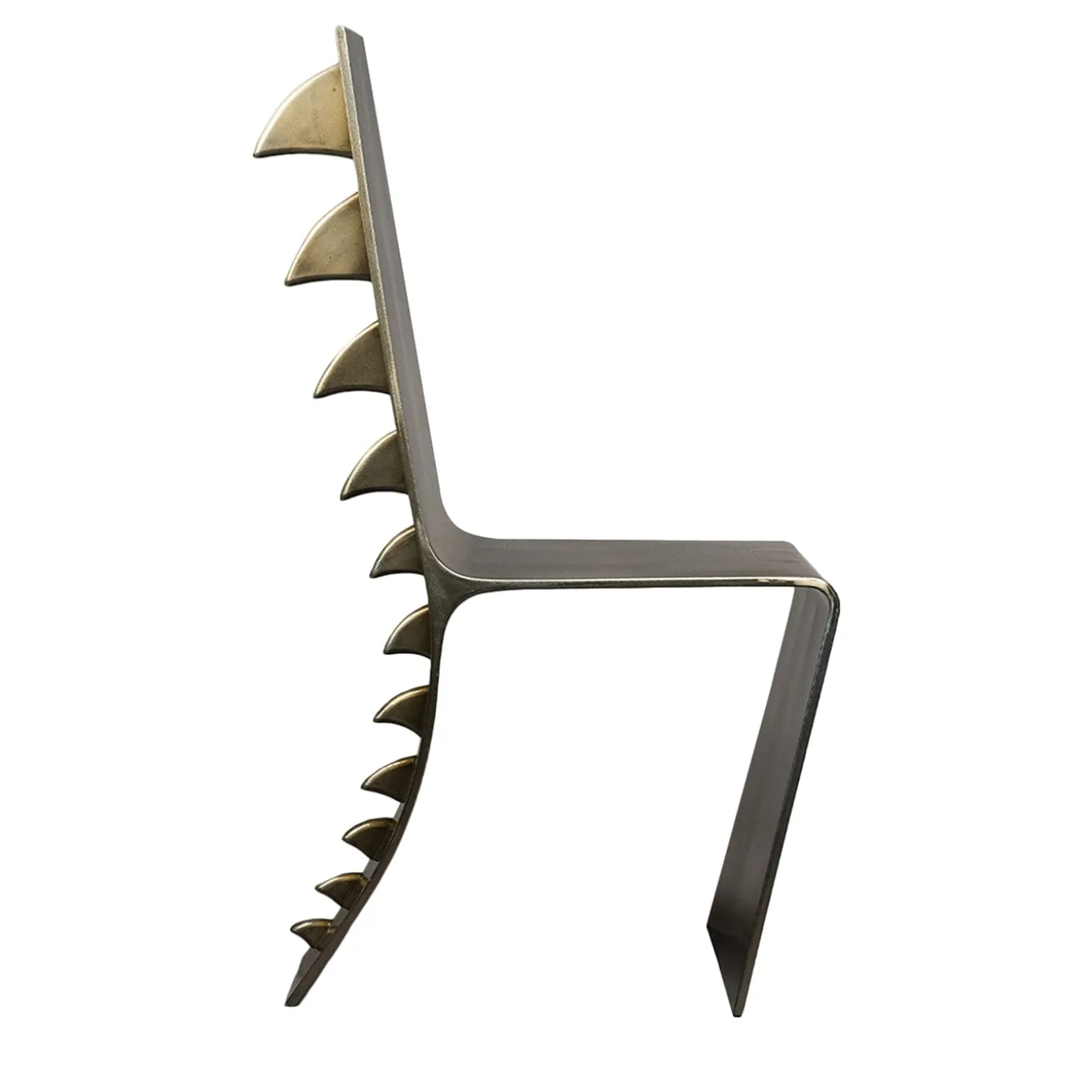 The chair is designed in a modern and refined design work handmade in iron by Italian craftsmen. The material offers comfort and durability, with a visual impression of lightness and modernity. Its curved shape creates an interesting play of light and shadow, giving the chair dynamism and movement. The distinctive feature is the inclusion of a row of scales on the back, which gives the chair a unique and bold aesthetic.