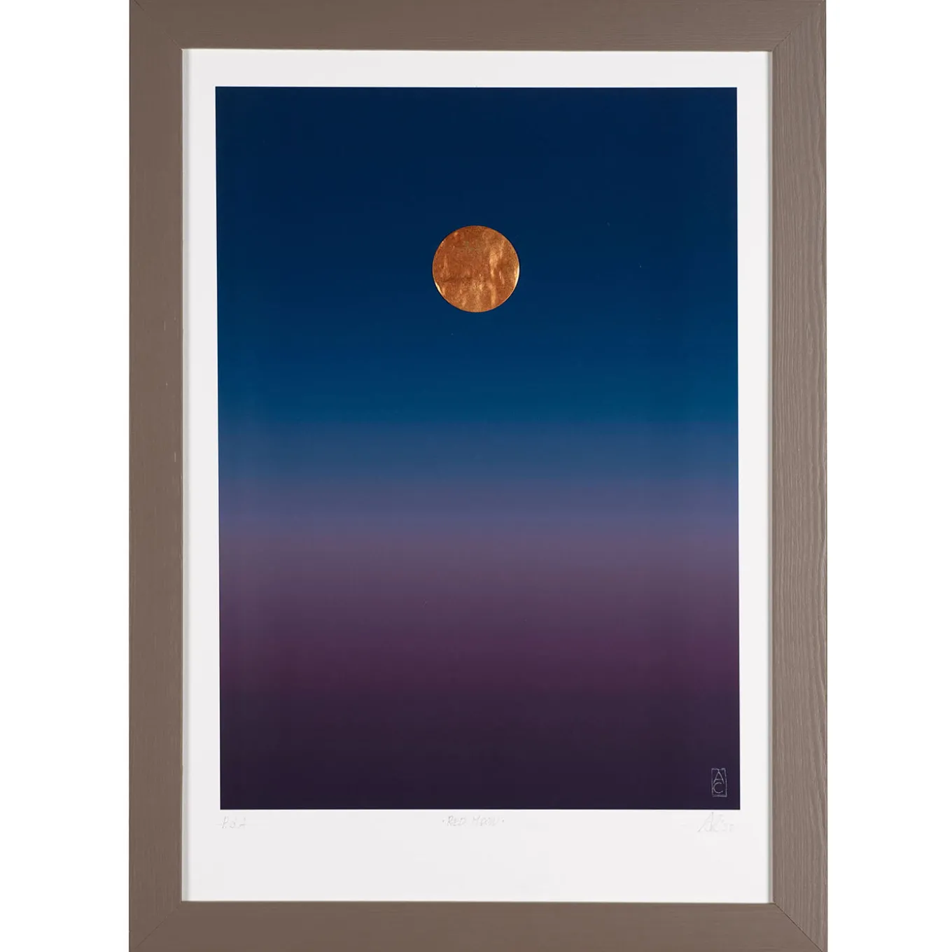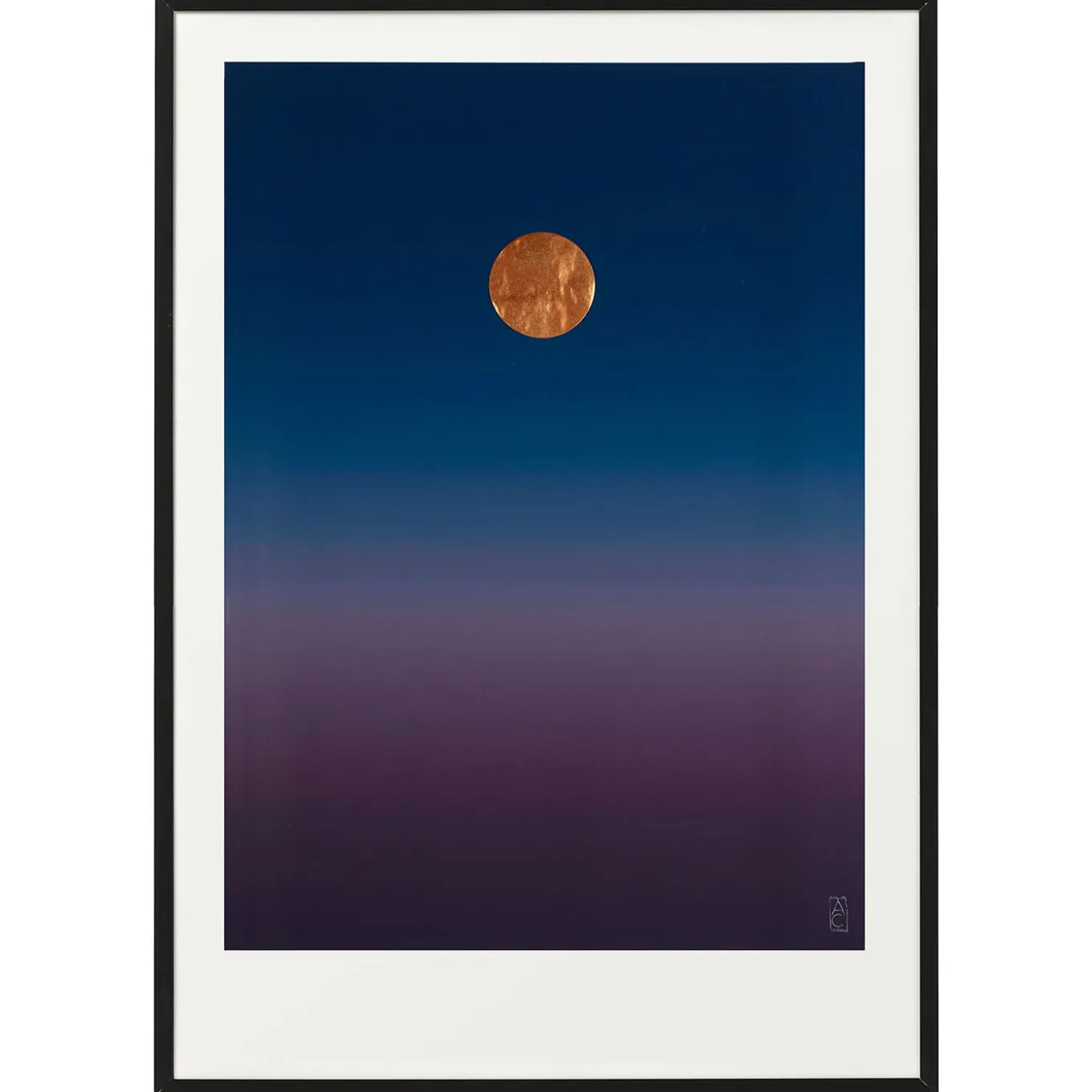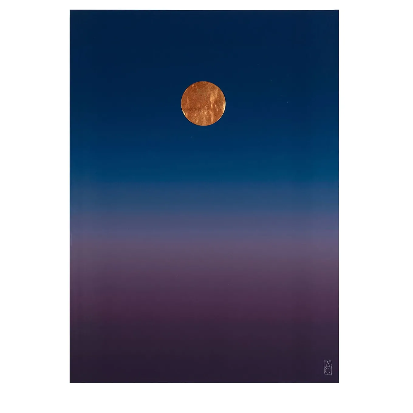 Plum progressively fades into blue with a golden moon plate in this dreamlike image made of fine glycée-type print on 100% cotton canvas. Inspired by the line “Che fai tu, luna, in ciel? dimmi, che fai, silenziosa luna?” poet Giacomo Leopardi dedicated to the moon, the print comes without a frame. Please consult the Concierge for the price of the frame and that of the variant measuring 50x70cm.
