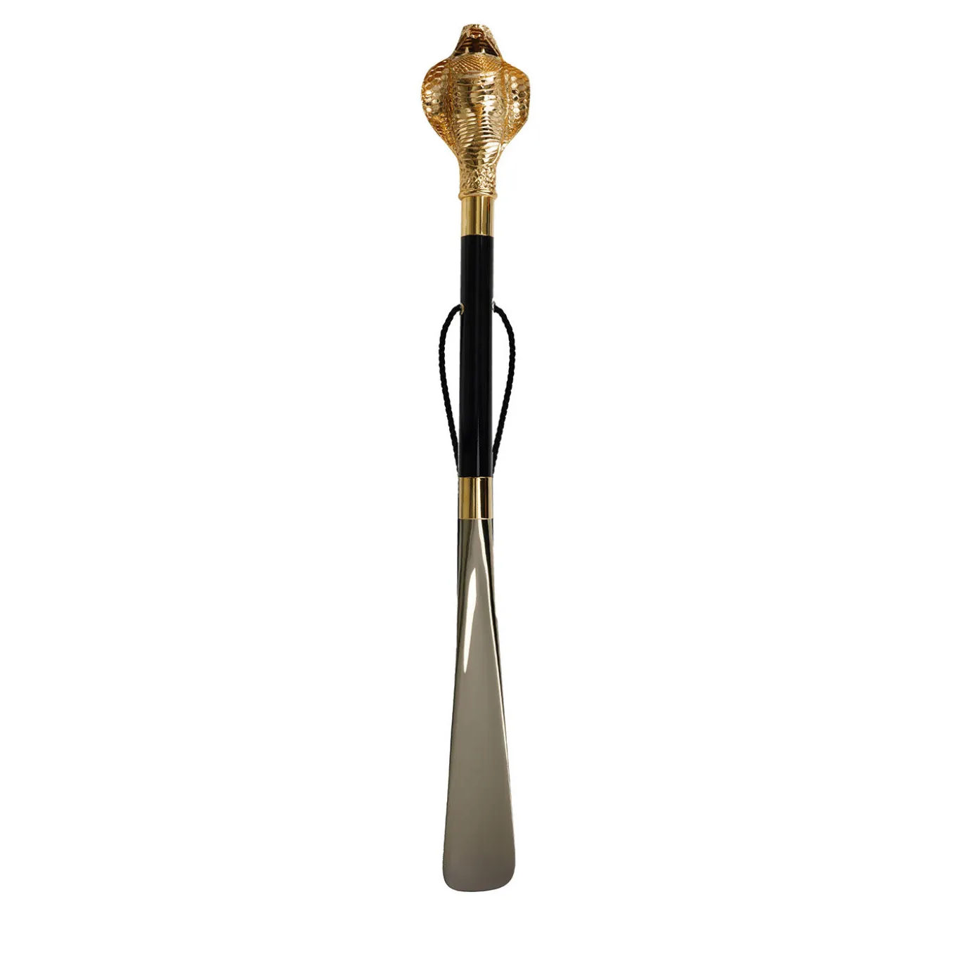 As lethal as it is fascinating, the cobra is the ornamental focus of this luxury, artisan shoehorn, delivered with a branded case and featuring an integrated loop for easy hanging. The central shaft lacquered in black with a glossy finish is combined with a golden paddle in ABS and held in place by means of gold-finished brass rings. The cobra’s brass head is rendered in exquisite details enhanced by a luminous golden finish.