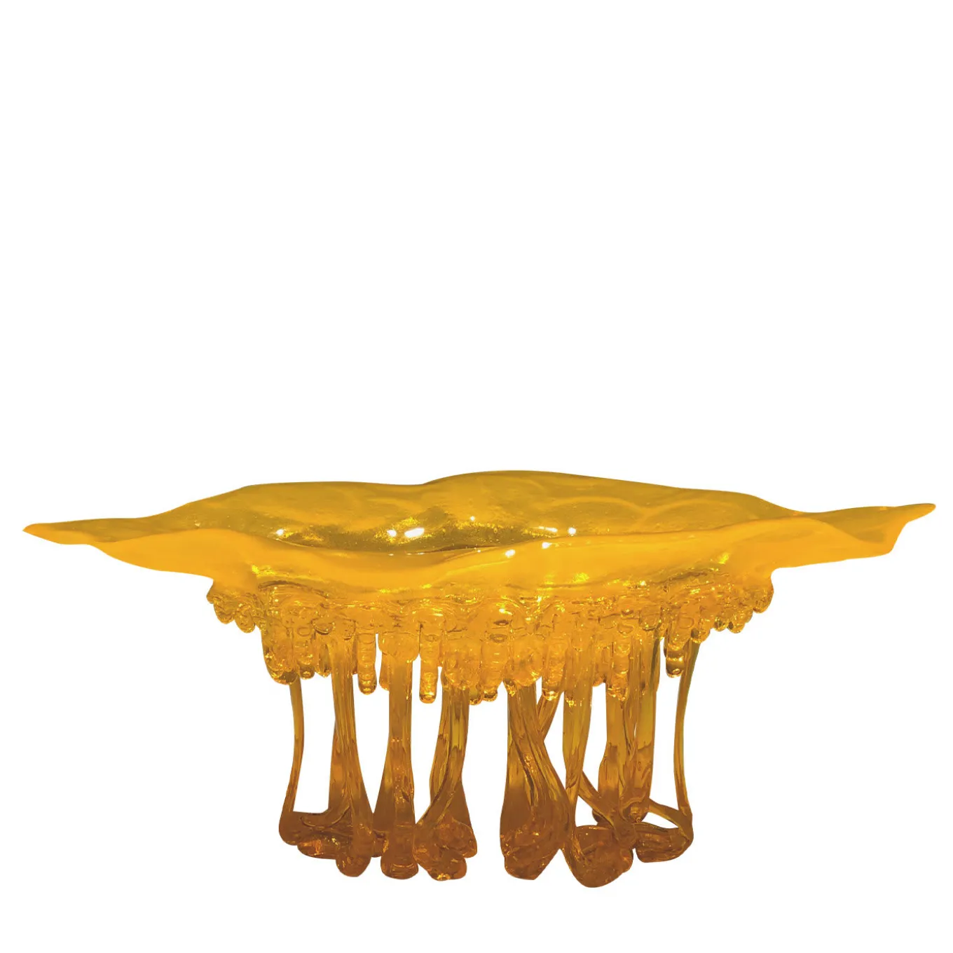 The pure gold hues of this gorgeous, honey-colored sculpture is made exclusively from Murano glass. Its unique shape with its upturned top and many tentacle-shaped dripping forms underneath is reminiscent of a jellyfish and its tentacles. Light filters through this piece onto surfaces on which it is placed, for an other-worldly, golden effect.
