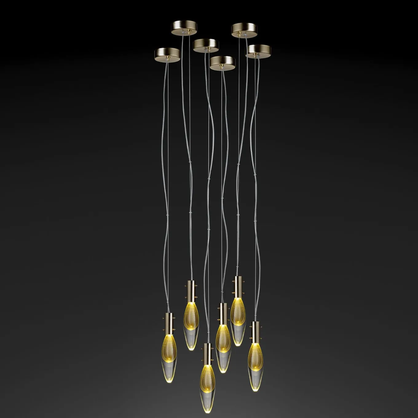 Innovative contemporary design exquisitely merges with refined traditional craftsmanship in this stunning chandelier, composed of six pendants handmade of Murano glass following the “burst glass” technique. Displaying a harmonious and warmly shaded design enhanced with natural reflections, it supports six LED bulbs (1.5 watts – 180 lumens + Included Driver). Please consult the Concierge for further information.