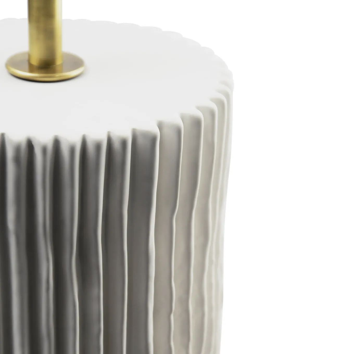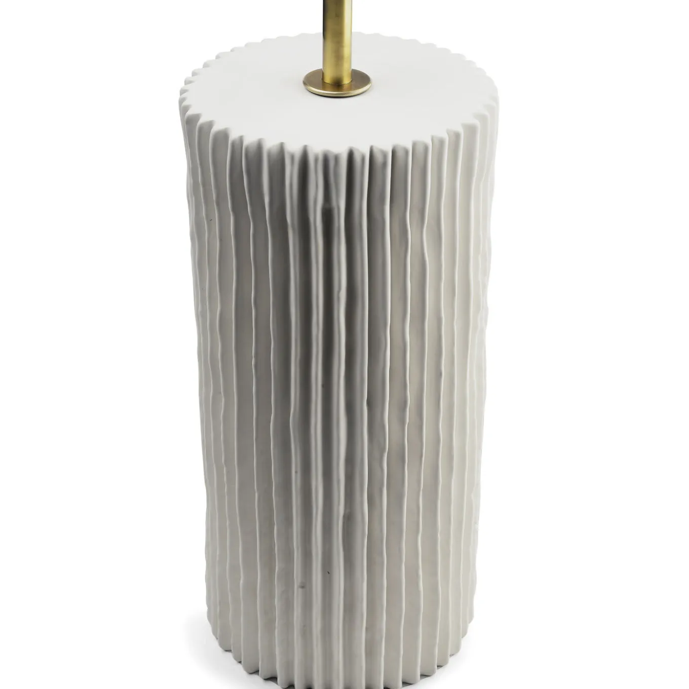 The base of this elegant lamp, designed by Studio 63 for Marioni, is a cylinder in white ceramic whose surface is decorated with ridges throughout. The body is in brass with a cylindrical diffusor that features a decoration of vertical ridges as well.
