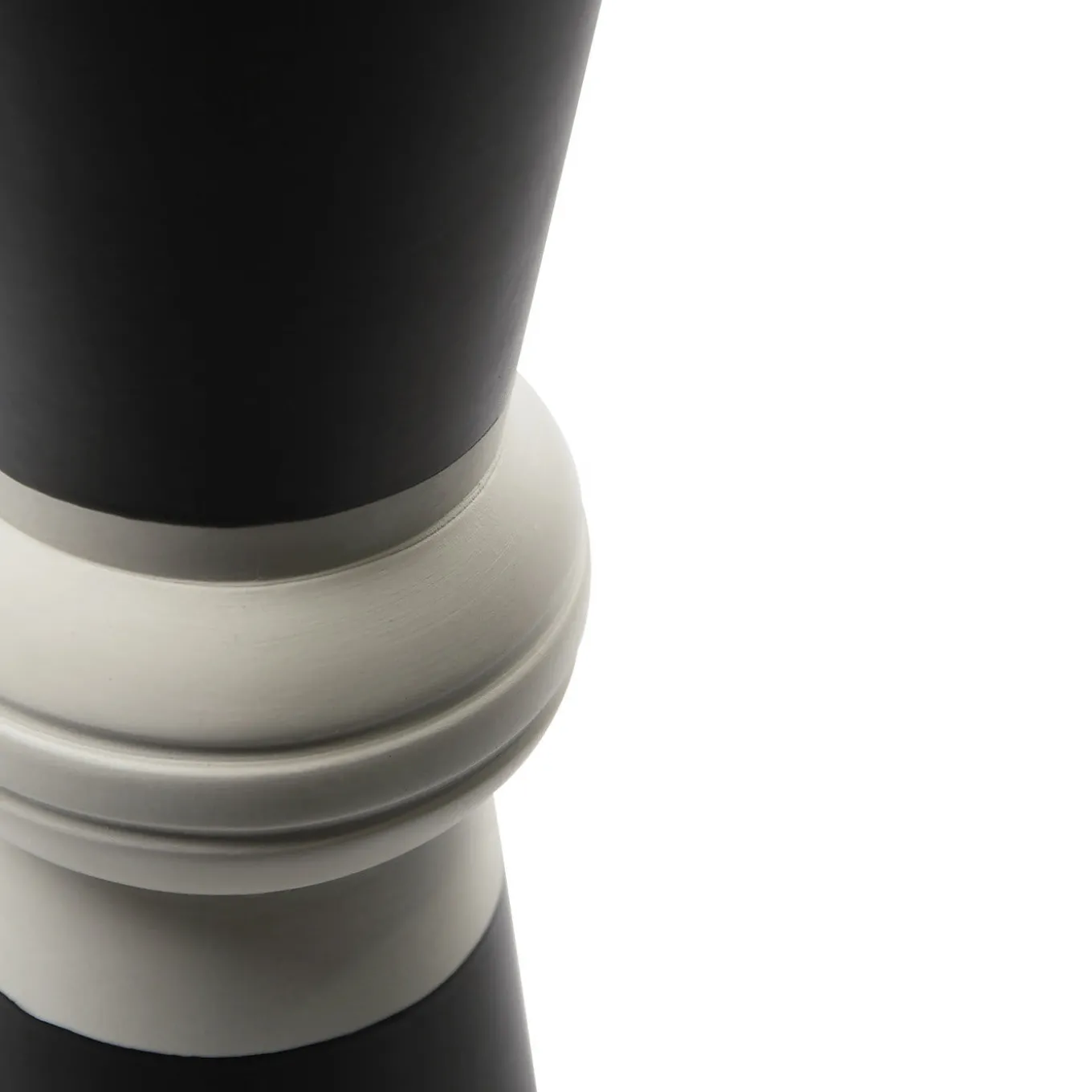 The base of this elegant lamp, designed by Studio 63 for Marioni, is a double-cone in black and white ceramic. The body is in brass with a cylindrical diffusor that features a decoration of vertical ridges.