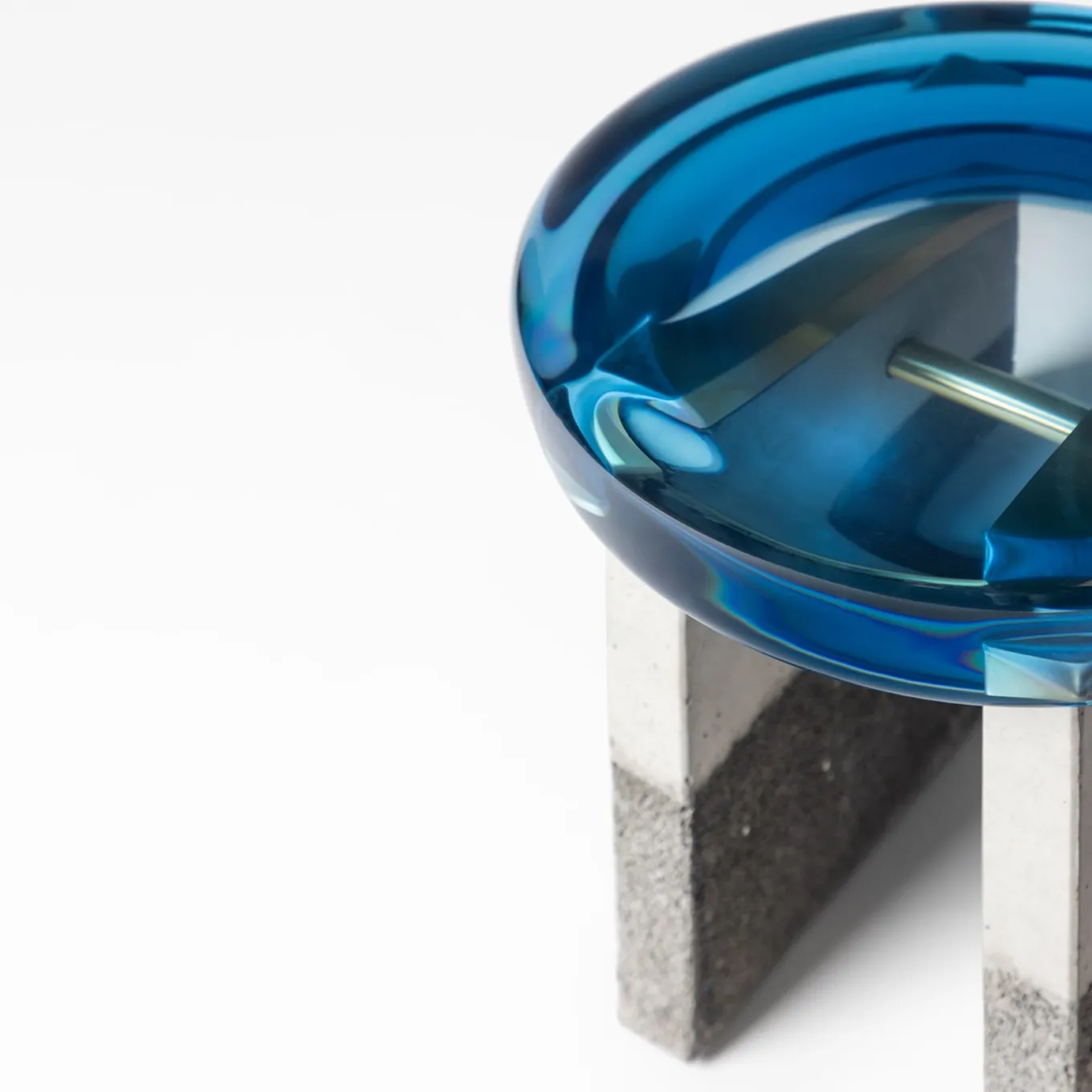 Comprising a stylized formal composition, Golia stool presents a thick round epoxy resin seat resting upon two squared concrete legs. The transparent resin reveals the shiny metal links below, creating a multi-level view that lightens the solidity of the base. Available in different colors.