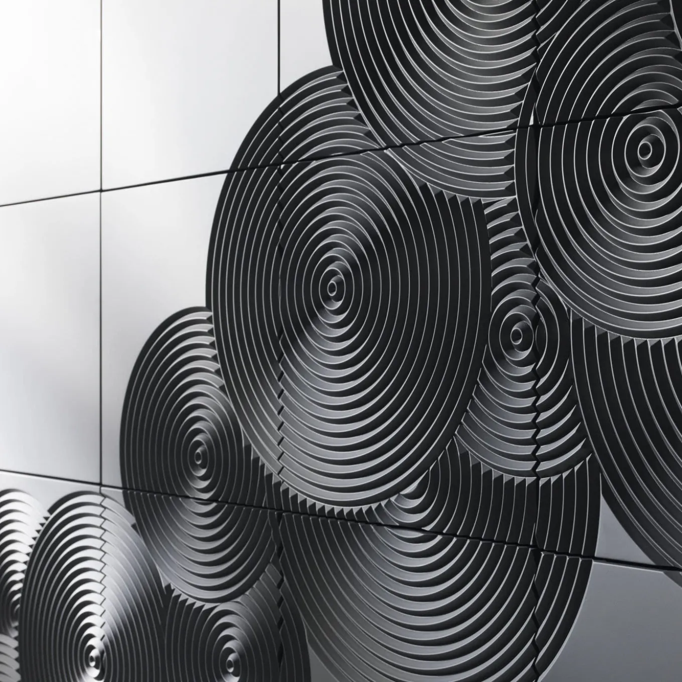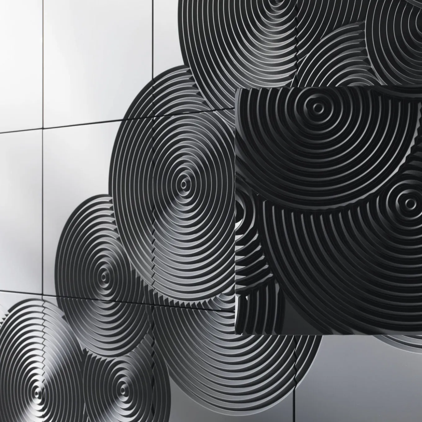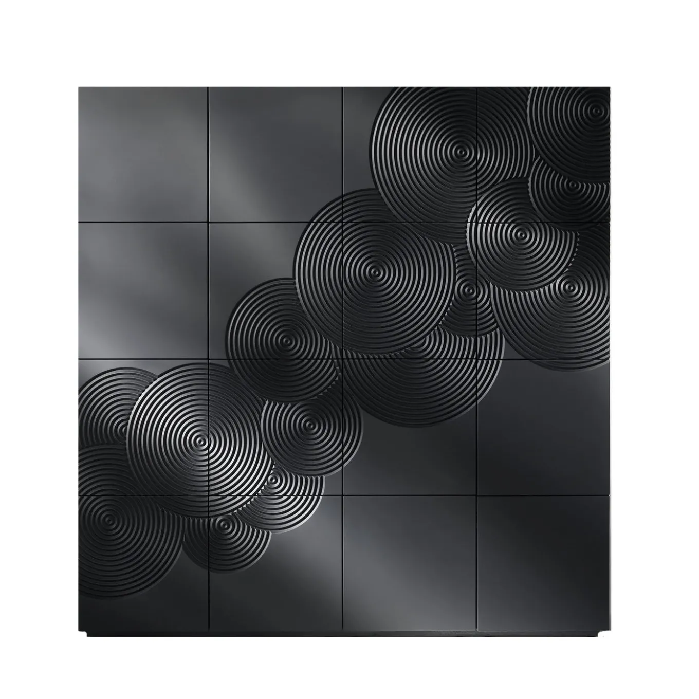 This cupboard, composed of two modules to overlap, is both stylish and sophisticated. Its structure is crafted from MDF, which stands for medium-density fiberboard, a dense and durable wood fiber. The matte black lacquered surface boasts a striking glossy finish and a bas-relief decoration of concentric circles that run diagonally across the 16 squares. This elegant creation features a total of 8 doors, with each door consisting of two vertically paired squares. Upon request and for an additional cost, the cupboard can be customized with a single opening for each square. The interior of this cupboard is equipped with four shelves, ensuring generous storage space. Its contemporary design seamlessly complements modern decor.