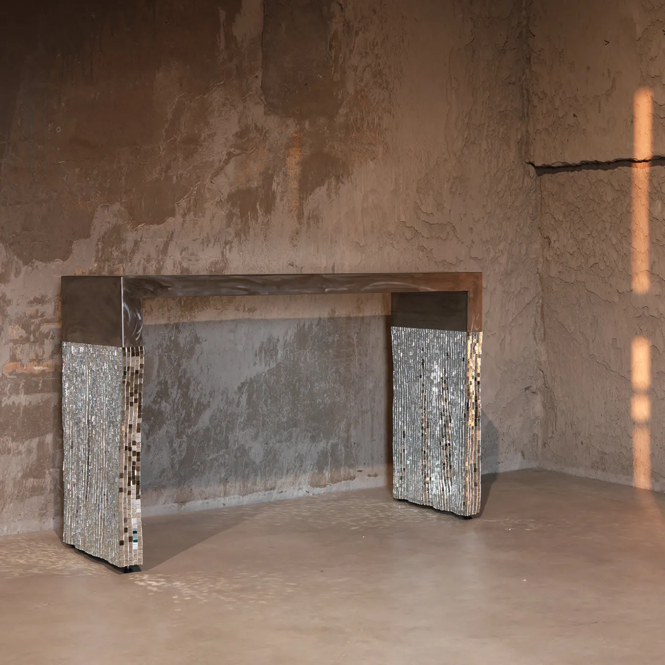 There is more than meets the eye in this superb console handcrafted of stainless steel with a streamlined silhouette that is perfectly suited for both modern and contemporary interiors. The bold rectangular legs are embellished with a stunning mosaic of silver mirrored glass tiles, cut and laid individually by hand in a meticulously detailed work performed by skilled artisans. Adding character to an entryway or living room, this console can be paired with any wall mirror by Davide Medri for a truly eye-catching look. Available also in gold and a smaller version (144 x 40 x H90 cm).