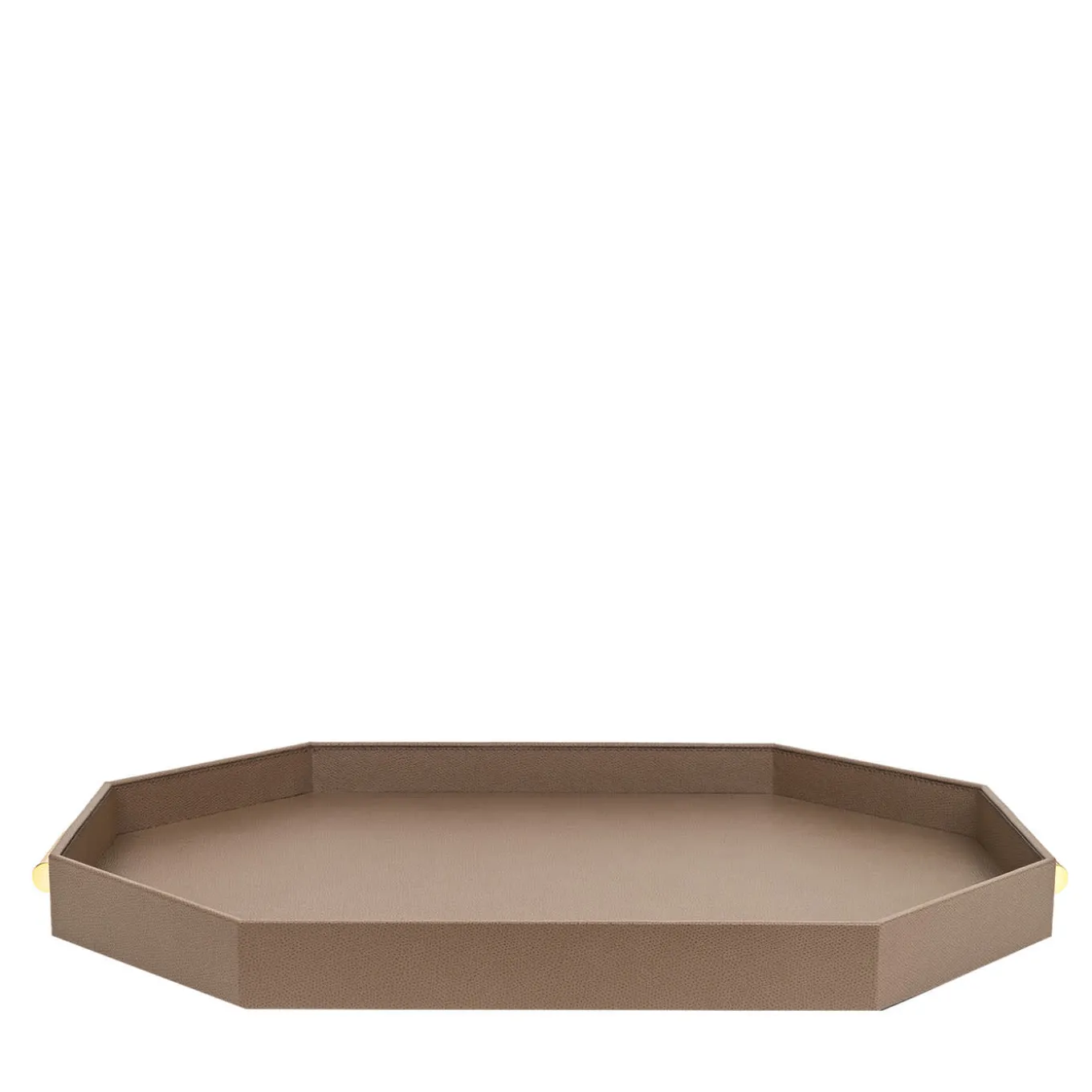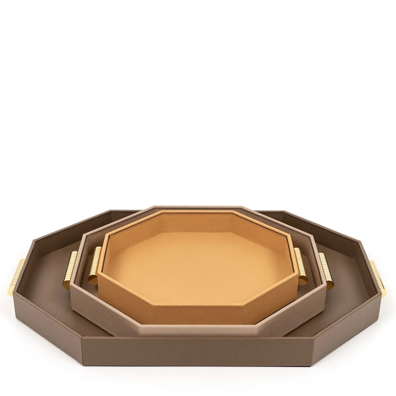 Characterized by the timeless and elegant lines of the Grace Collection of stackable trays, this design embodies the perfect blend of aesthetic and functionality. Entirely upholstered with brown leather enhanced with tone-on-tone stitchings, it features a capacious octagonal shape completed with golden handles. It is customizable in leather type, color, size and metal finish. Please consult the Artemest catalog for other designs from this series.