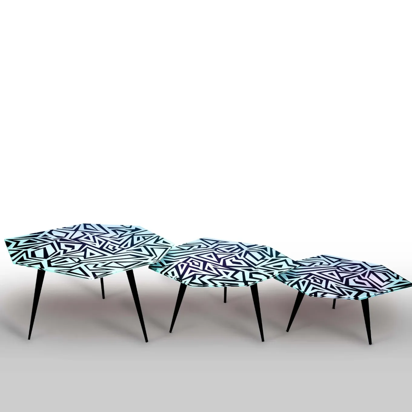 This trio of tables is characterized by a strong, international, elegant and innovative character. Each coffee table is a unique piece. It is handmade to order with the utmost care and attention to detail. The entire support structure is made of brass with a matt black finish. The geometrically shaped top is in hand-engraved crystal at the bottom. Every piece is unique, due to handcrafting, slight changes may occur. Please, ask the Concierge for further information.