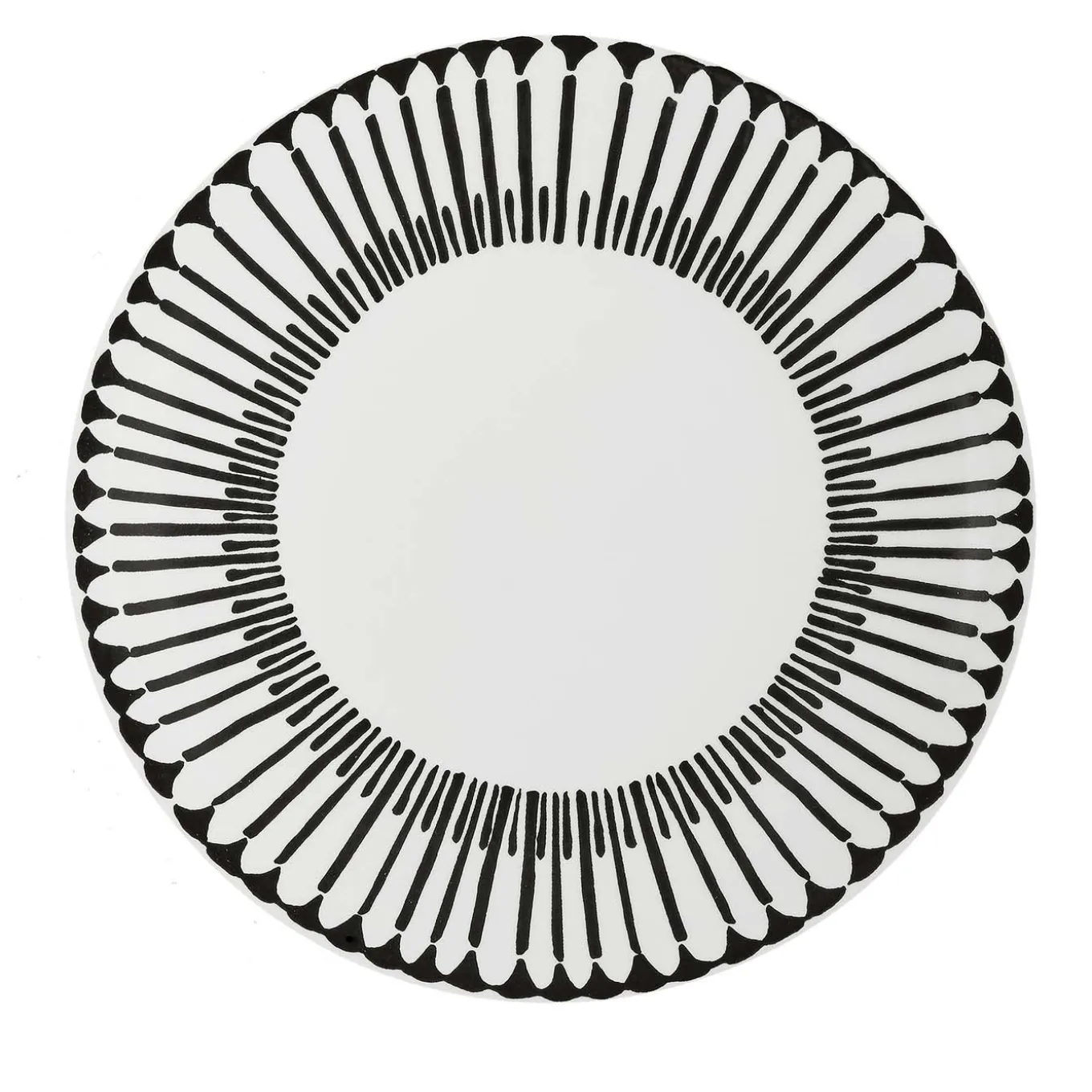 A striking expression of originality, this bold plate embodies minimalist elegance and dynamic simplicity. Crafted of white porcelain using traditional hand-making techniques, the plate is adorned with a black, geometric design along the edge, the alternating long-short pattern creating the illusion of movement with its beaming rays. Gifted to a loved one in a set with others from the Grafismi series, these plates will be a statement in any decor. The plate measures 31 cm.