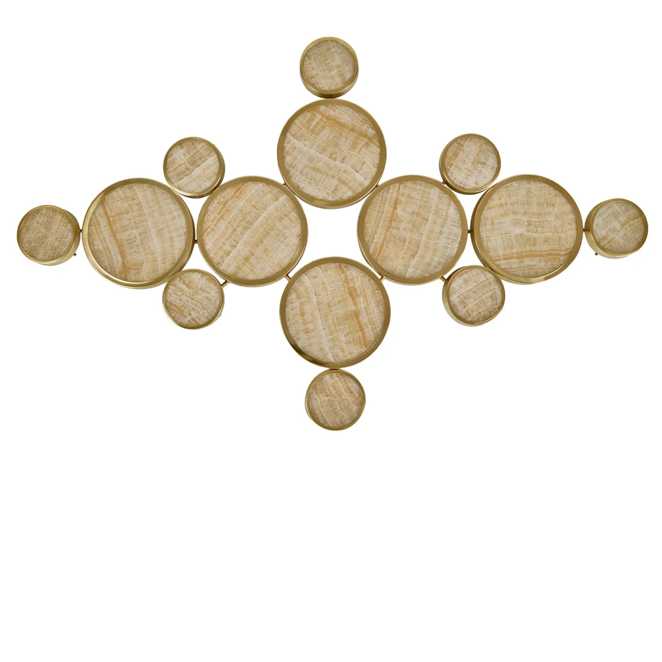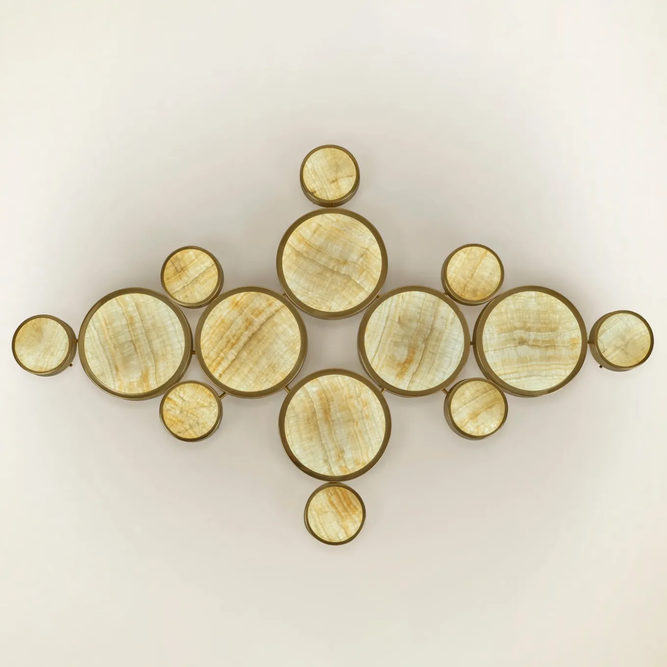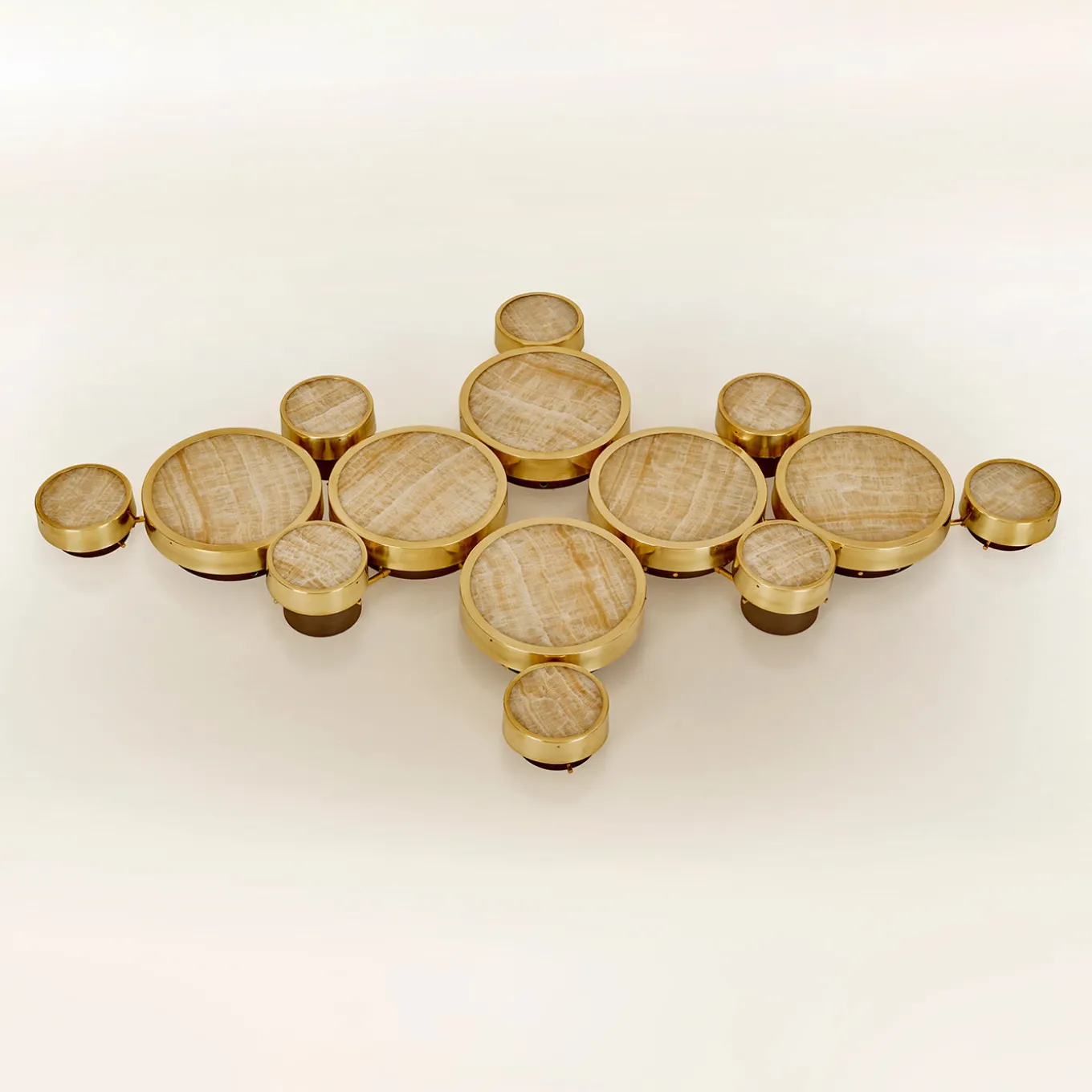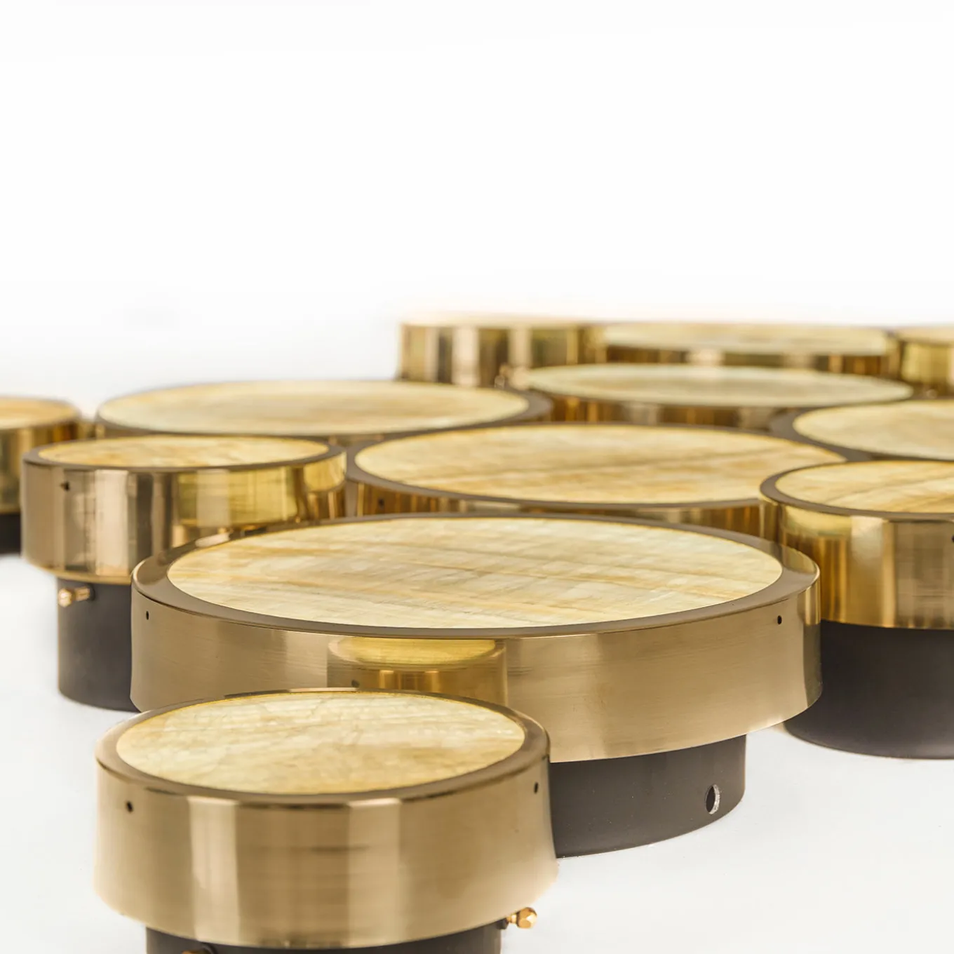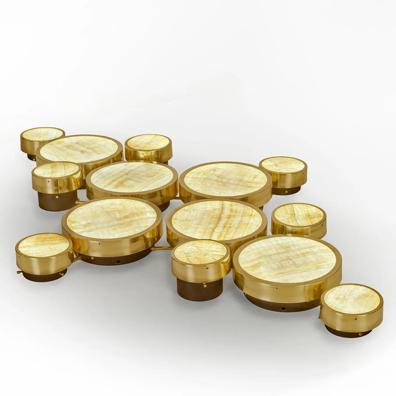 Gemini, part of the Gran Costellazione series, is a large flush mount chandelier featuring six large and eight small circular elements arranged in a fractal pattern, inspired by the Gemini constellation. Measuring 121 x 85.5 cm (48 x 34 inches), it combines onyx diffusers within brass frames to deliver a sculptural design with ample light output. Designed to illuminate spacious areas without obstructing views, it uses high-efficiency LED technology providing up to 20,000 lumens, dimmable with standard residential triac dimmers. Custom finishes and materials available on request, contact the Concierge for more details.