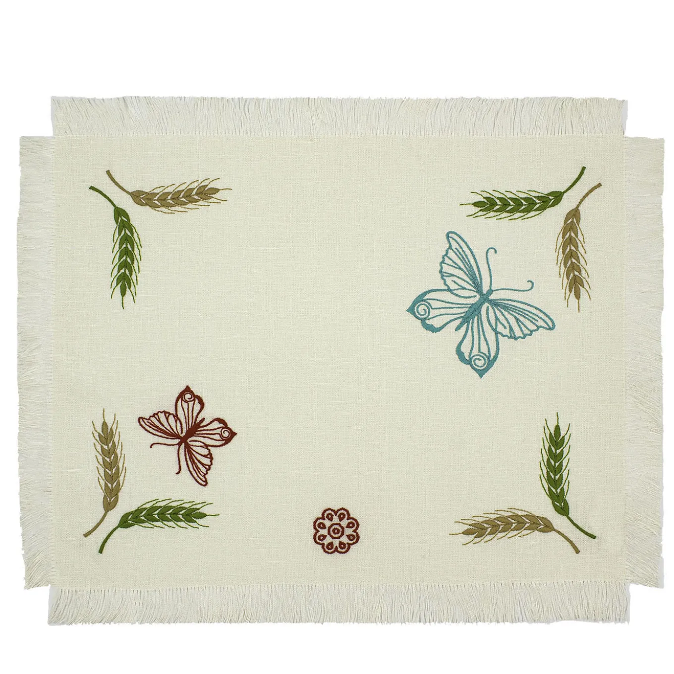 This precious set of two table mats in fine Masters of Linen-certified ivory linen is the canvas where exquisite manual embroideries of spikes and butterflies – symbols of rebirth – in Mako cotton are welcomed. Skilled artisans painstakingly attend to every detail during the hours-long embroidery process. Multiple color options are available in the Artemest catalog.