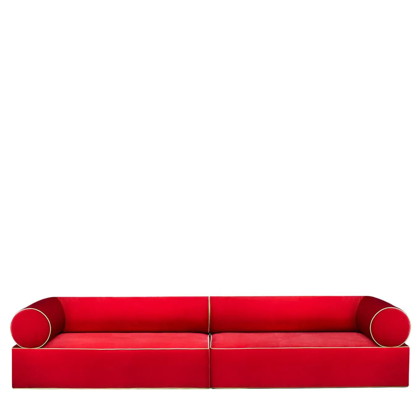 Thanks to generous inner padding nestled within rigorous geometric volumes, this sofa from the Graphius Collection is at once plump and rigorous. It is sure to imbue contemporary decors with playfulness and style. The cylindrical-cut armrests and backrests at once contrast and harmonize with the rectangular-cut seats, all their volumes sealed by a vibrant red fabric cover with yellow piping along the edges. Additional fabrics and finishes are available upon request. Contact the concierge for more details.
