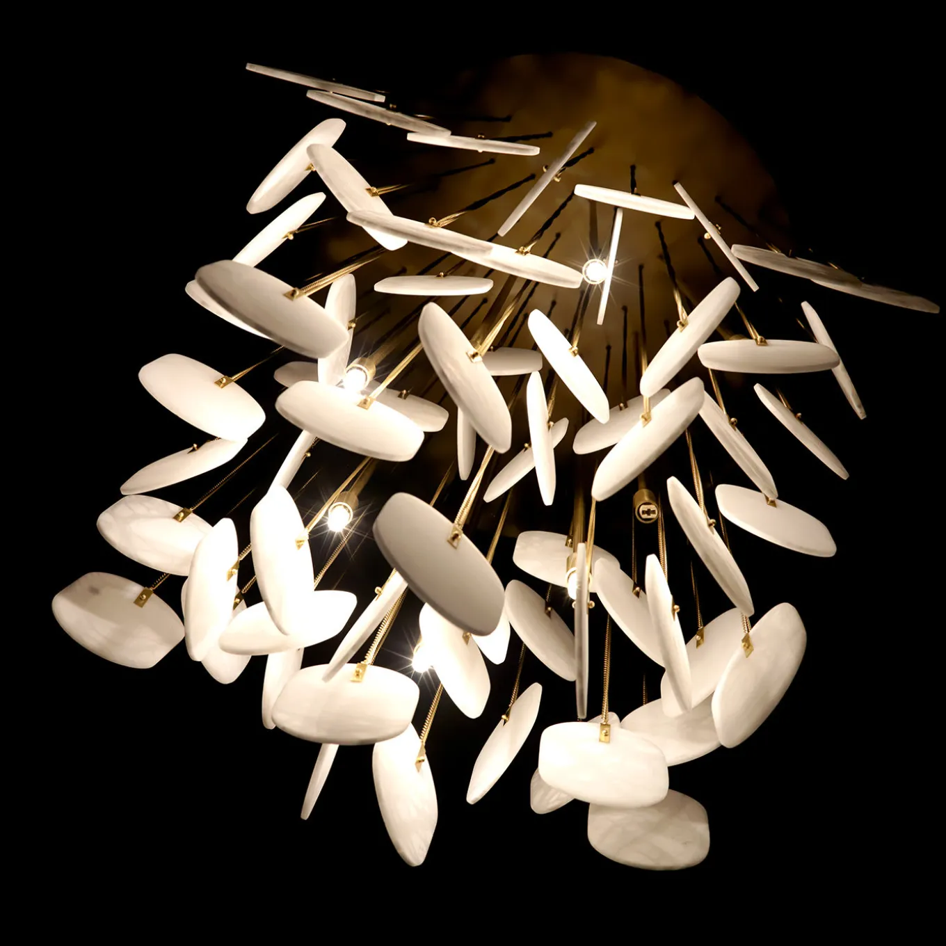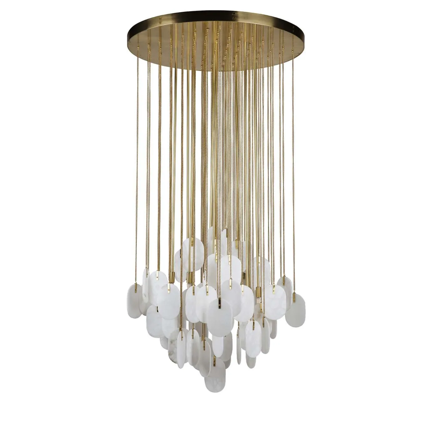 This superb chandelier will be an imposing decorative element to showcase in a large living room, above an opulent dining table, or in a stately entryway. Aptly named Gravity for the cascade of elements that make up its structure, this piece is a superb addition to a modern or contemporary home. Its round base supports a multitude of brass rods with pendant decorations at their ends. This unique silhouette hides eight lights and functions as their one-of-a-kind shade, creating intriguing effects.