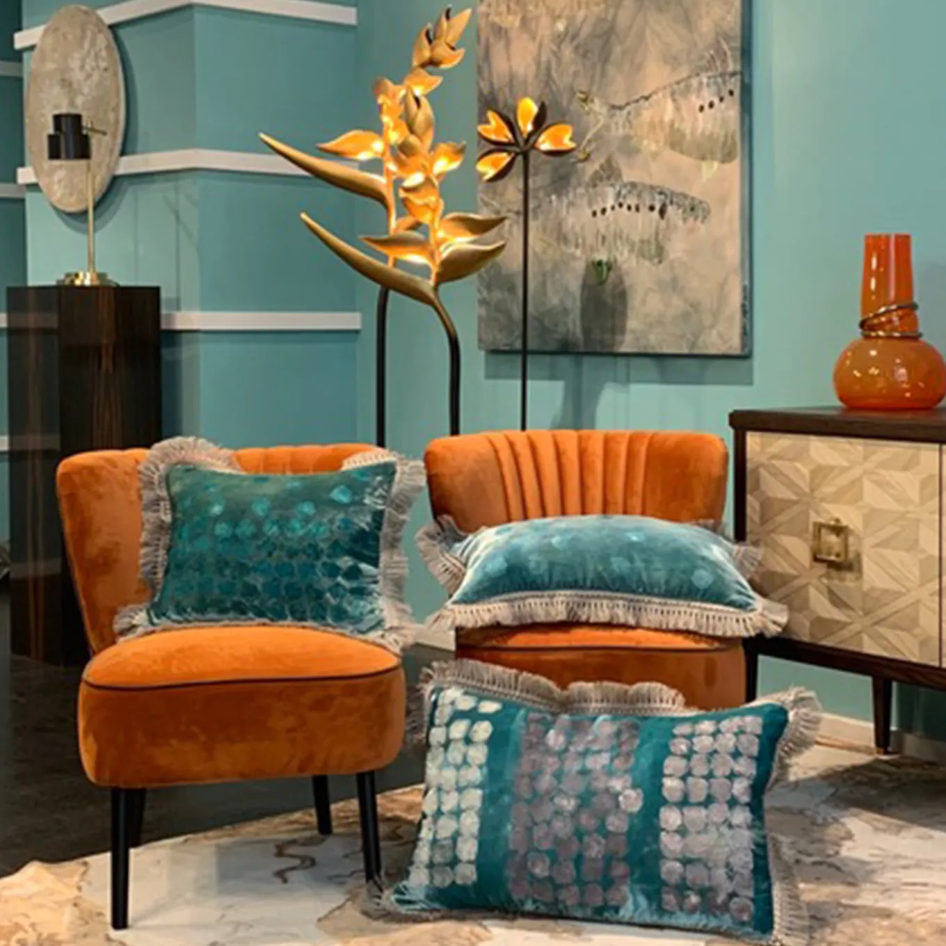 With a splendidly creative appeal, the silk velvet Gray Flowers Cushion is dyed with green and blue colors and hand painted with colored paste. This deluxe cushion, with a delightful design of small stylized flowers, features a trimming in gray linen thread and is complimented by a back in elegant gray silk.