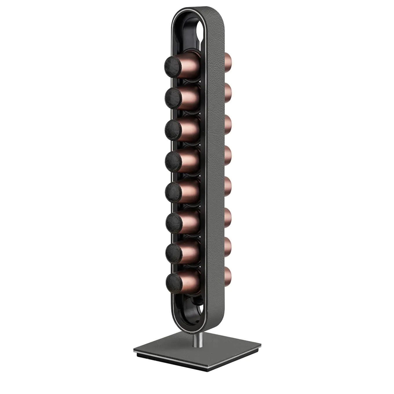 This sophisticated kitchen and office accessory, crafted from premium leather, provides convenient storage for up to 18 capsules. The thoughtfully designed top opening allows for effortless capsule retrieval, ensuring both functionality and style. Presented in an exquisite gray color, it is designed by Ekaterina Borovkova.
