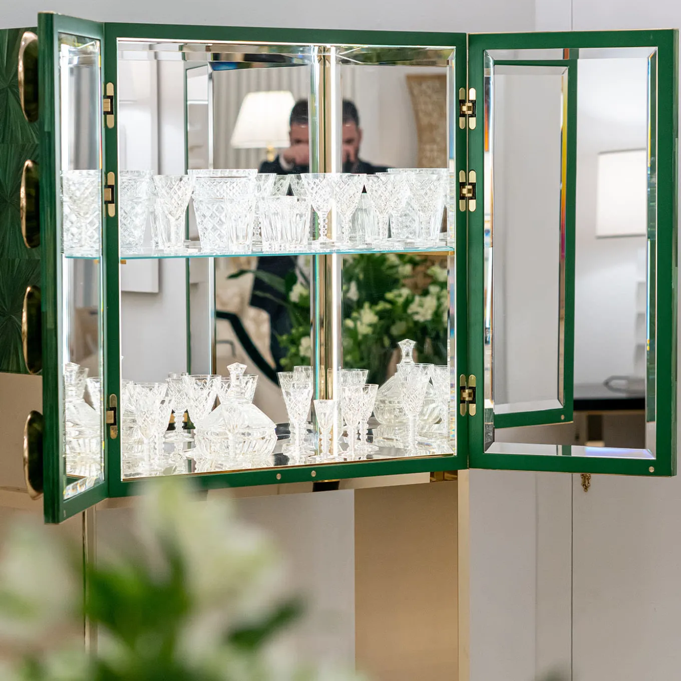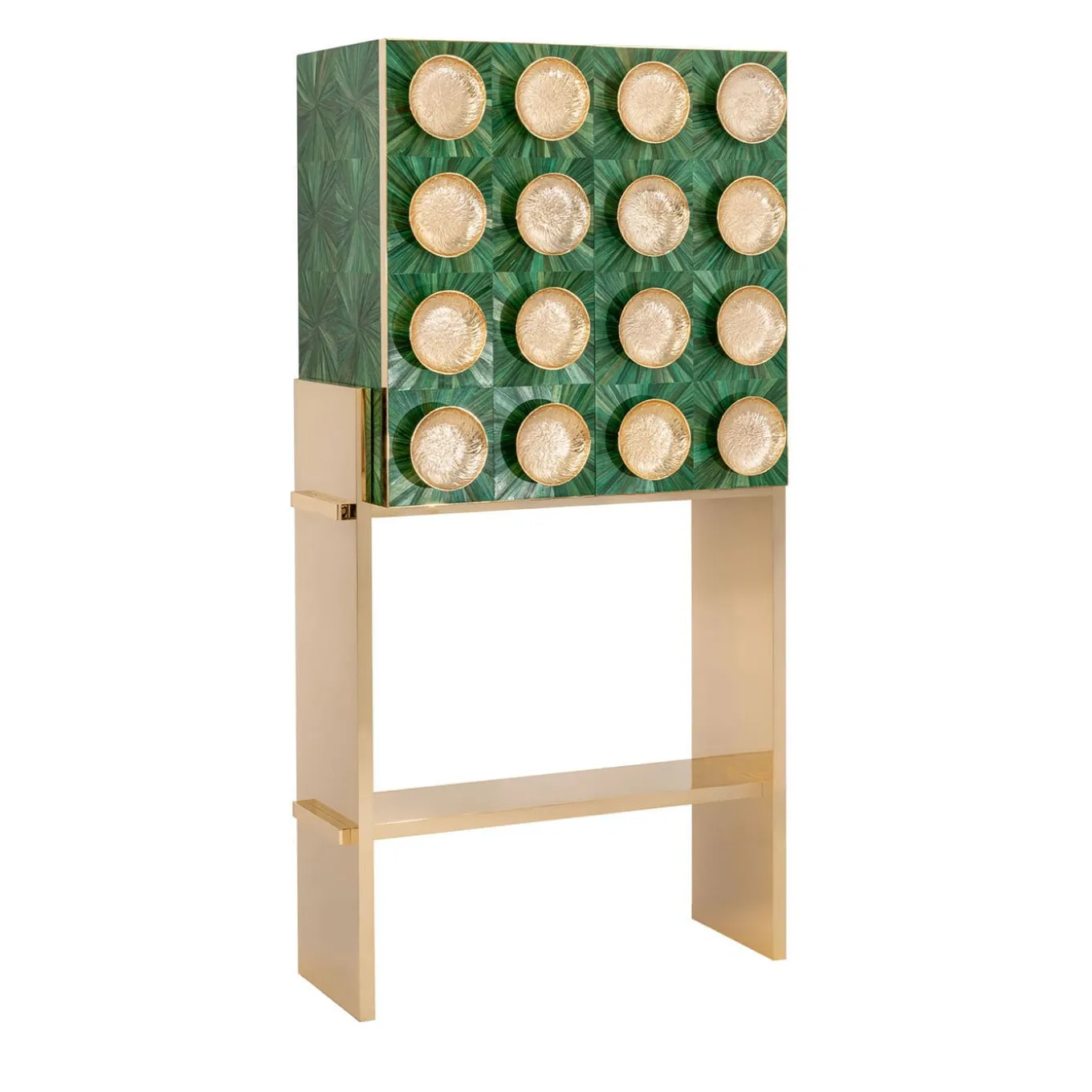 A marvelous showcase of traditional craftsmanship employing high-quality materials, this bar cabinet will make for an outstanding and precious addition to a dining room or living room decor. Fashioned of solid wood covered with 18K gold-plated and mirrored stainless steel sheets, its front is decorated with French straw marquetry in sunbeams rendered in a green shade and decorative handles in 18K gold-plated metal. Please contact the Concierge for further details.