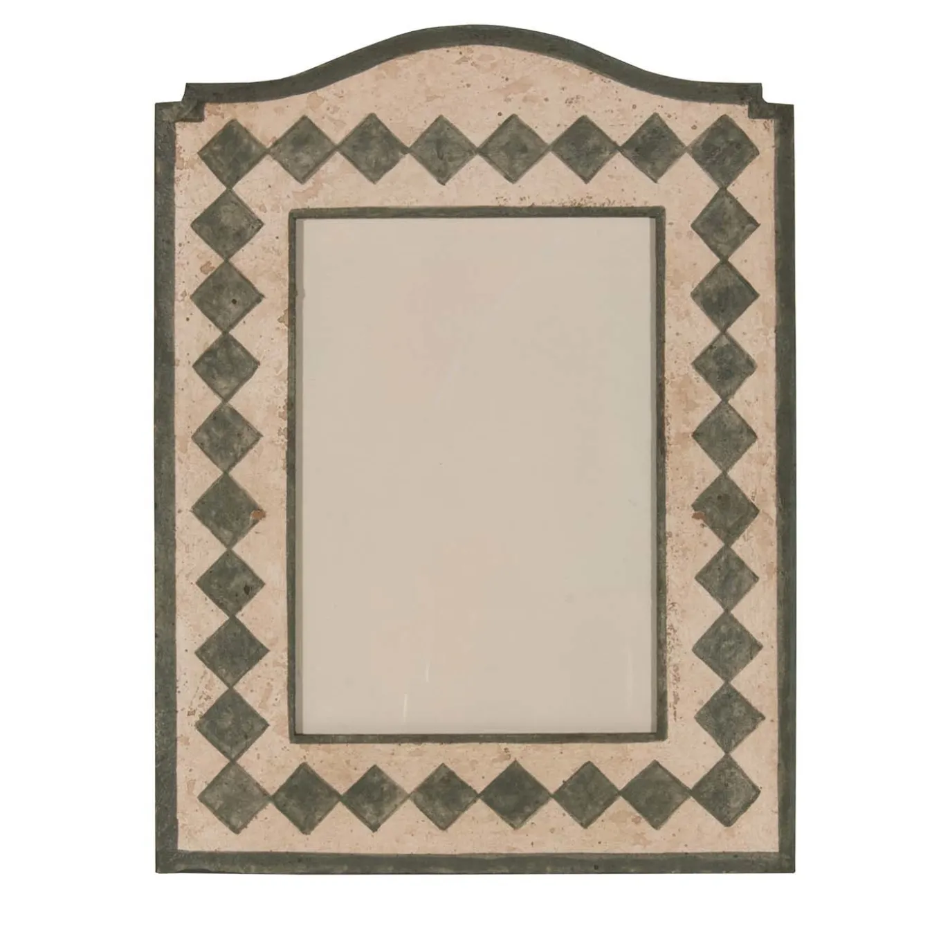 This classic picture frame is a refined accent piece that will enliven a rustic entryway or living room. Fashioned using ancient Florentine crafting methods, this wooden frame is hand painted in white acrylic tempera with green diamond accents and border trim with a protective beeswax finish. The frame has a marbled texture made with a sponging technique evoking the “encausto veneziano” finish found on Florentine church and palace fa√ßades. More than a decorative object, this frame will display cherished memories with a timeless style. Protective glass panel and metal back clips included.