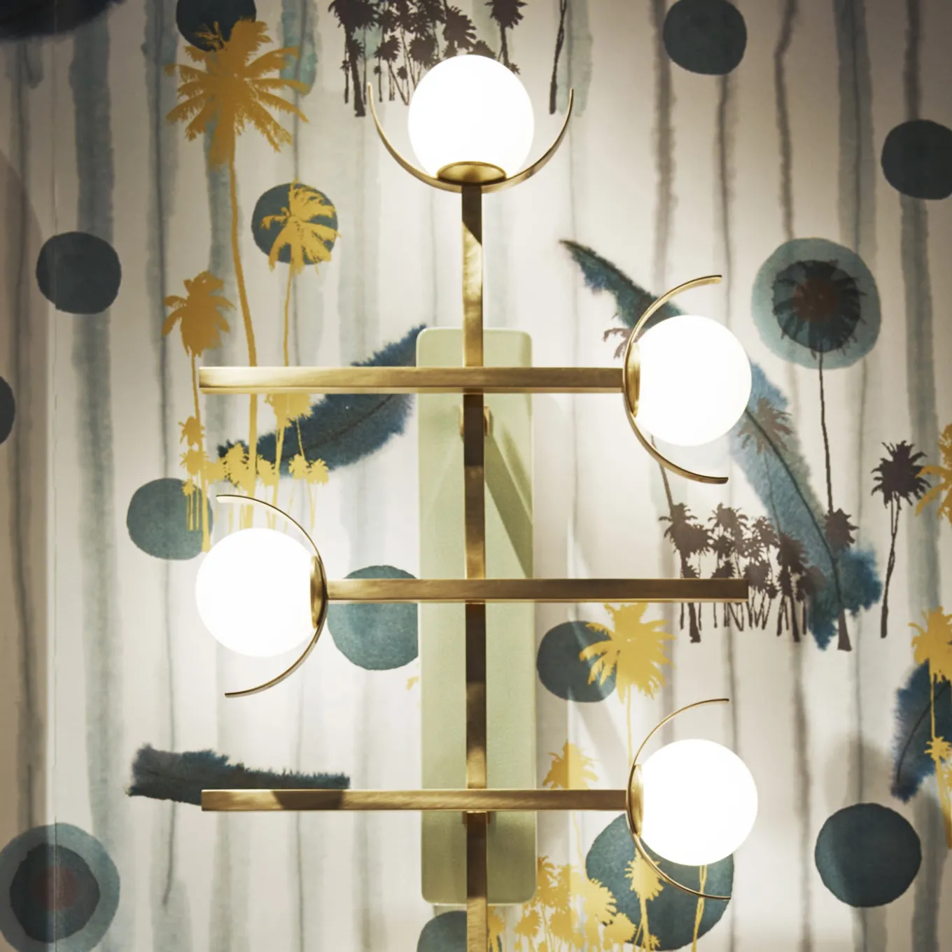 Designed by Piero Angelo Orecchioni for Marioni, this refined wall lamp was presented at the 2019 edition of the Salone del Mobile di Milano. The ceramic support holds a brass frame made up of four crossing elements holding four elegant spherical lights in acid-etched glass. The piece can be installed both vertically and horizontally and will add a bright accent to a hallway or entryway in a modern home. Other color combinations are available, please consult the Concierge for details.