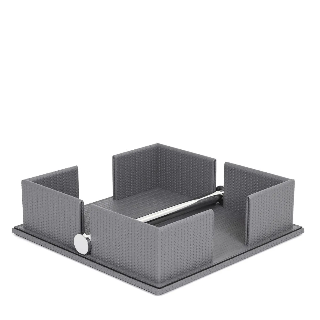 The napkin holder in gray leather features a satin brass or chrome weight, with an intrecciato finish. Perfect for both small and large napkins, it accommodates sizes 12×12 cm or 20×20 cm. Available in a variety of colors and leathers. Contact the concierge for more information.
