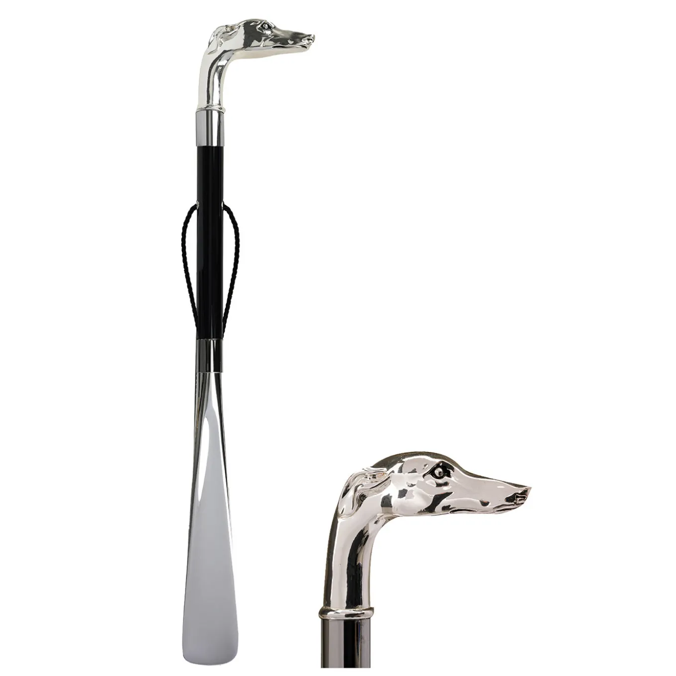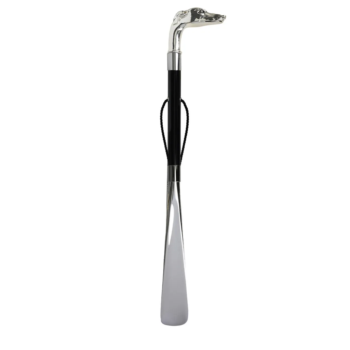 The upstanding flair of greyhounds is encapsulated in the zoomorphic handle of this ornamental shoehorn, luxe accessory that is handcrafted and equipped with a branded case. Coated with sterling silver and fashioned of marble powder, the handle is connected to the beech shaft lacquered glossy black, which tops the silvery paddle in ABS. Silver-finished brass rings keep the elements in place. An integrated loop allows for practical hanging.