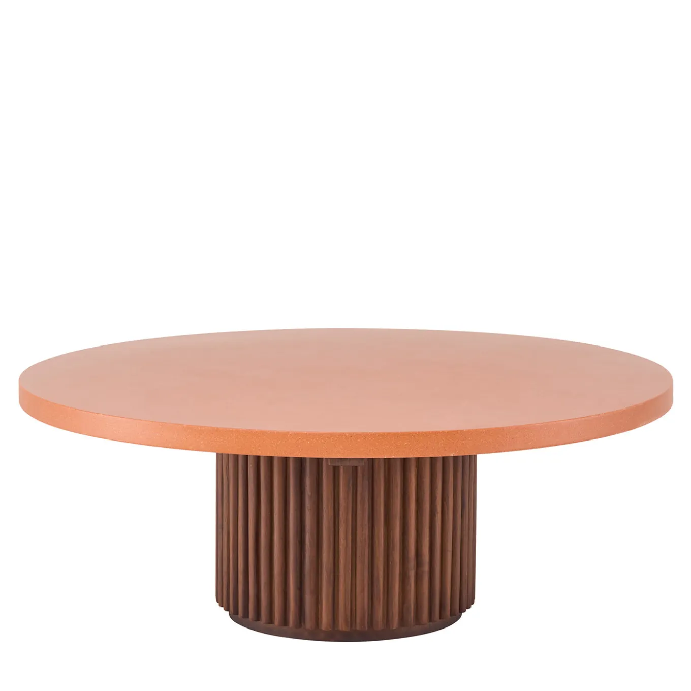 The Grissini coffee table features a distinctive design inspired by the elongated shapes of Turin breadsticks, showcasing clean lines and geometric detailing. Its medium-sized circular top is highlighted by a warm orange finish, resting on a textured, cylindrical base with vertical grooves. The table blends contemporary aesthetics with refined craftsmanship, making it suitable for gardens, terraces, and indoor spaces alike. Other finishes are available upon request. For further information please contact the Concierge.
