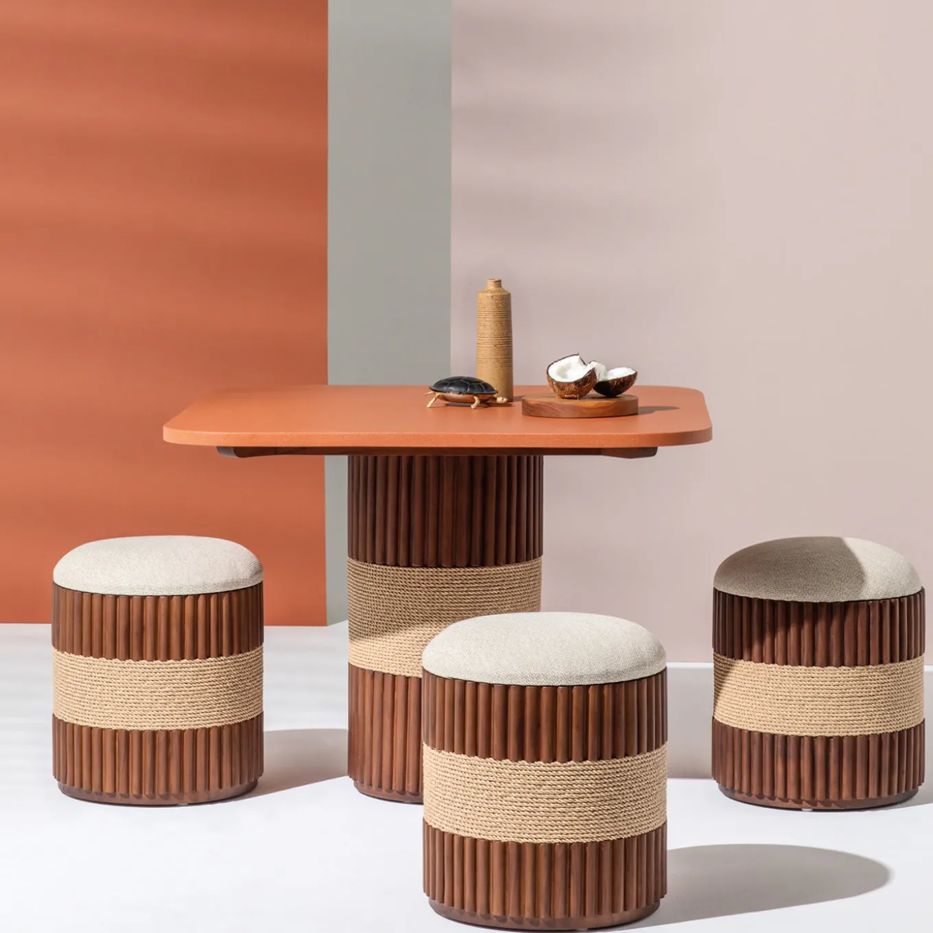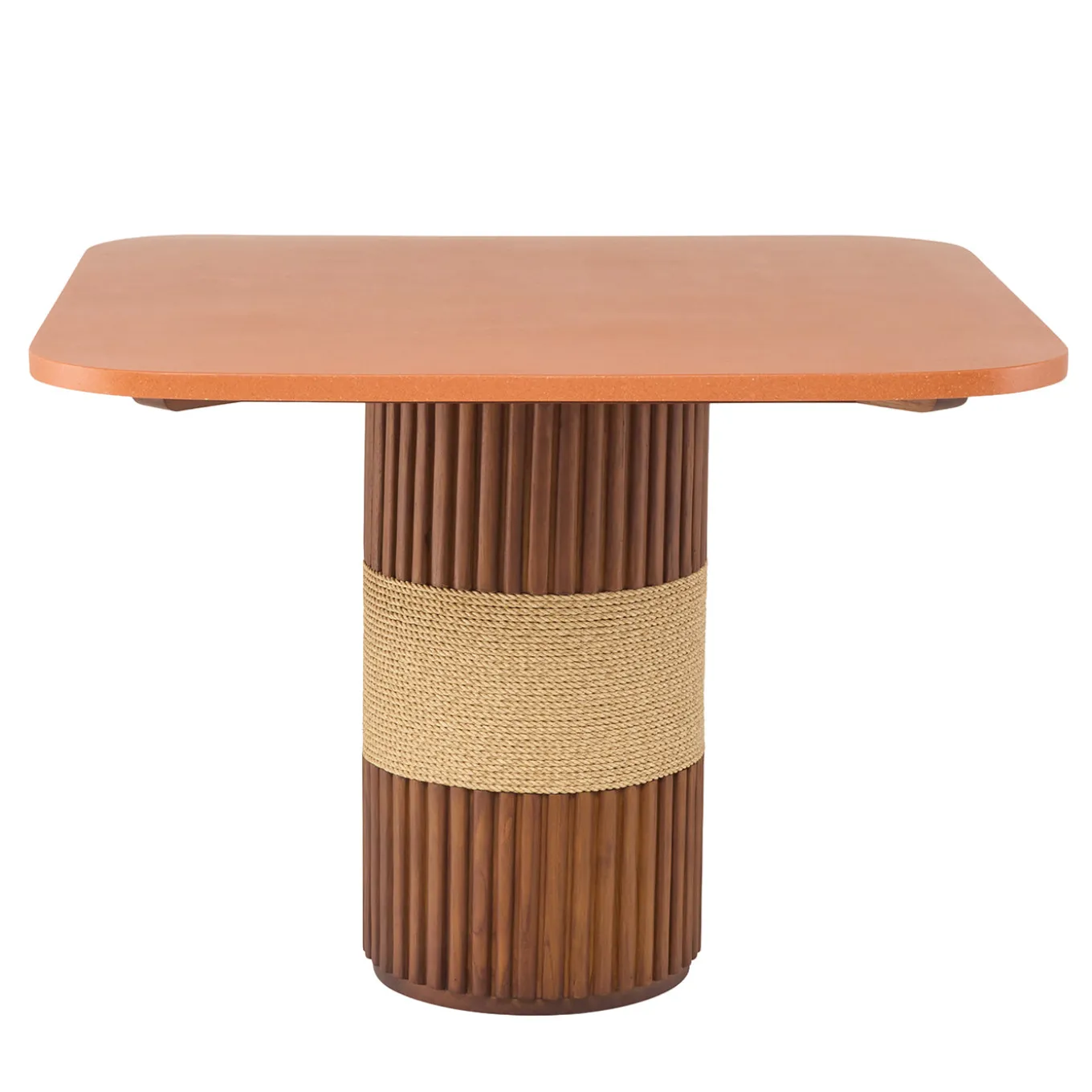 Grissini dining table combines contemporary design with refined craftsmanship, characterized by clean lines and a unique column base that echoes the linear shapes inspired by Turin breadsticks. The structure features a distinctive wrapped rope detail, enhancing its sculptural appeal. Designed to complement both outdoor and indoor spaces, it is finished with oil and wax for durability and a polished look.