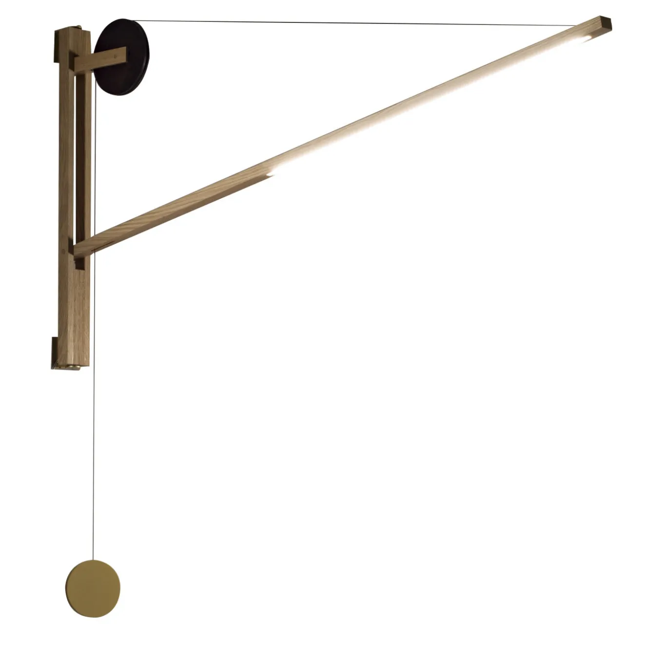 A sculptural piece of modern flair, this striking wall lamp boasts an inventive design inspired by the shape of a crane (“gru” in Italian). Exquisitely crafted of wood, the horizontal arm is equipped with a touch dimmable LED light. A unique mechanism marked by a hanging pendulum allows changing the position of the lamp.