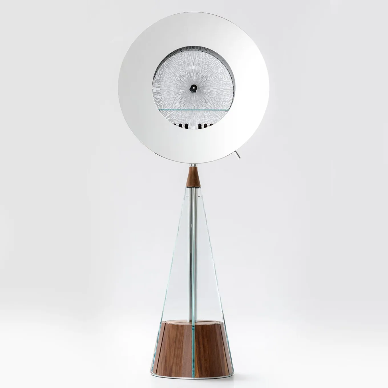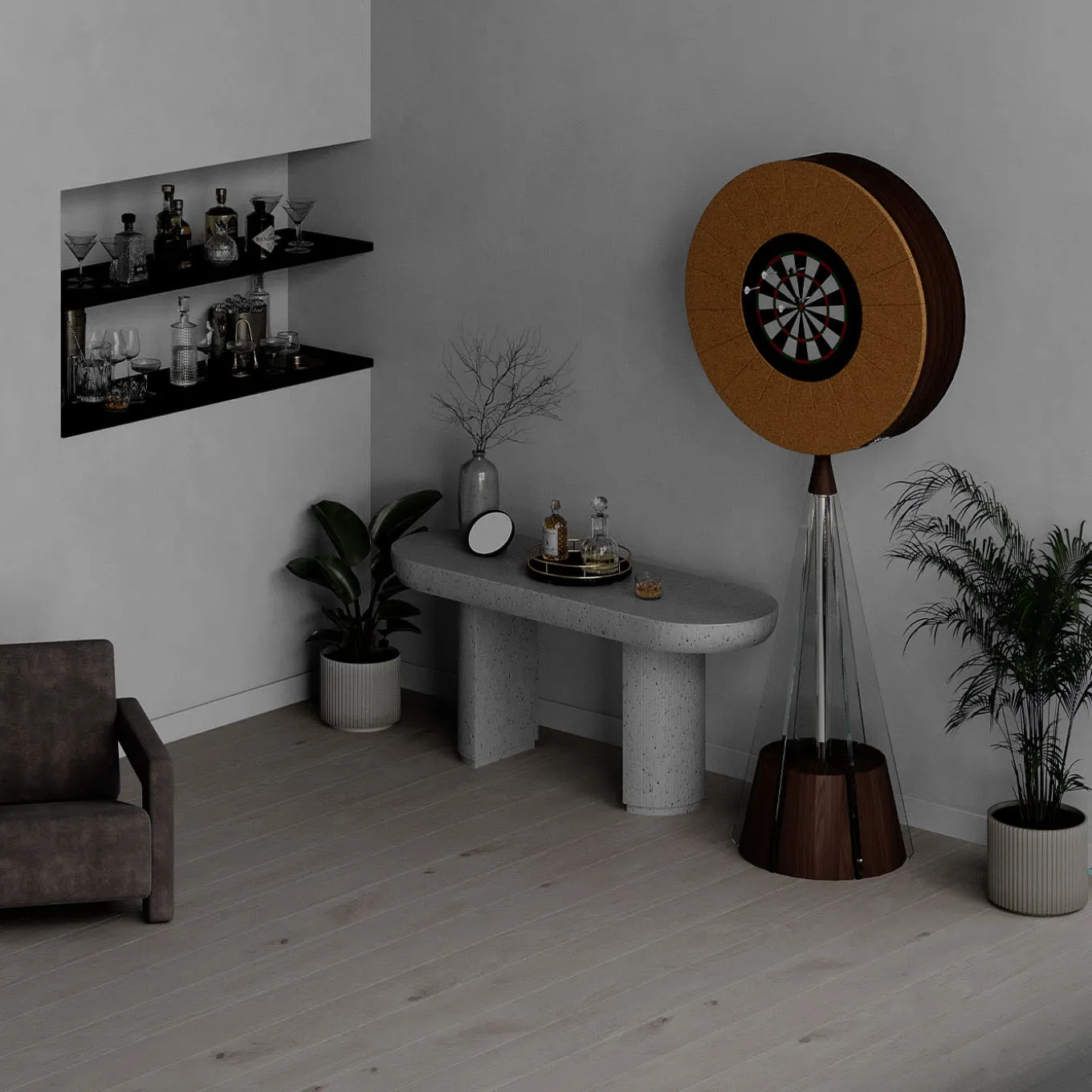 Gualtiero is a dual-sided indoor piece blending function and style. Side A, Cabinet of Curiosities, features a circular mirror that opens via a side knob, revealing a 50 cm compartment with a 15 cm deep shelf, ideal as a bar cabinet. Side B, Darts, is a playable dartboard with a cork frame, tempered glass, and wood. Made of Canaletto wood with steel and glass details, it is also available in black ash with an open-pore finish. Includes a dart set, magnetic laser, and Teckell toolkit. Contact the Concierge for more information.