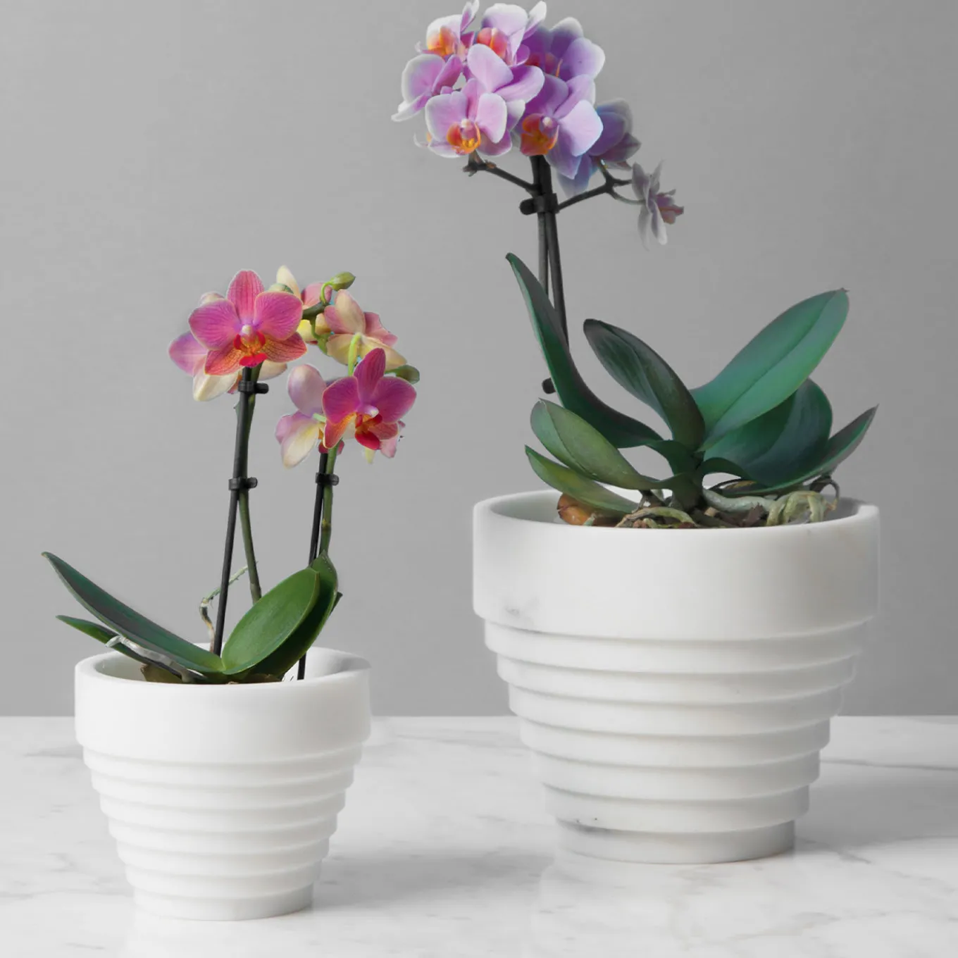 Inspired by the towering and dynamic architecture of the Guggenheim Museum – quintessential container for the finest contemporary art – this precious, conical pot flaunts a rigorous yet stimulating profile resembling an inverted stepped terrace whose tiers grow in diameter while proceeding upwards. The silhouette is fashioned of prized white Michelangelo marble, distinguished by a luminous look and delicate gray veining that state the uniqueness of each piece. Please note that marbles and stones are natural materials and they can differ also if coming from the same quarry or the same block. The product shown may differ from purchased items. Every piece is unique.