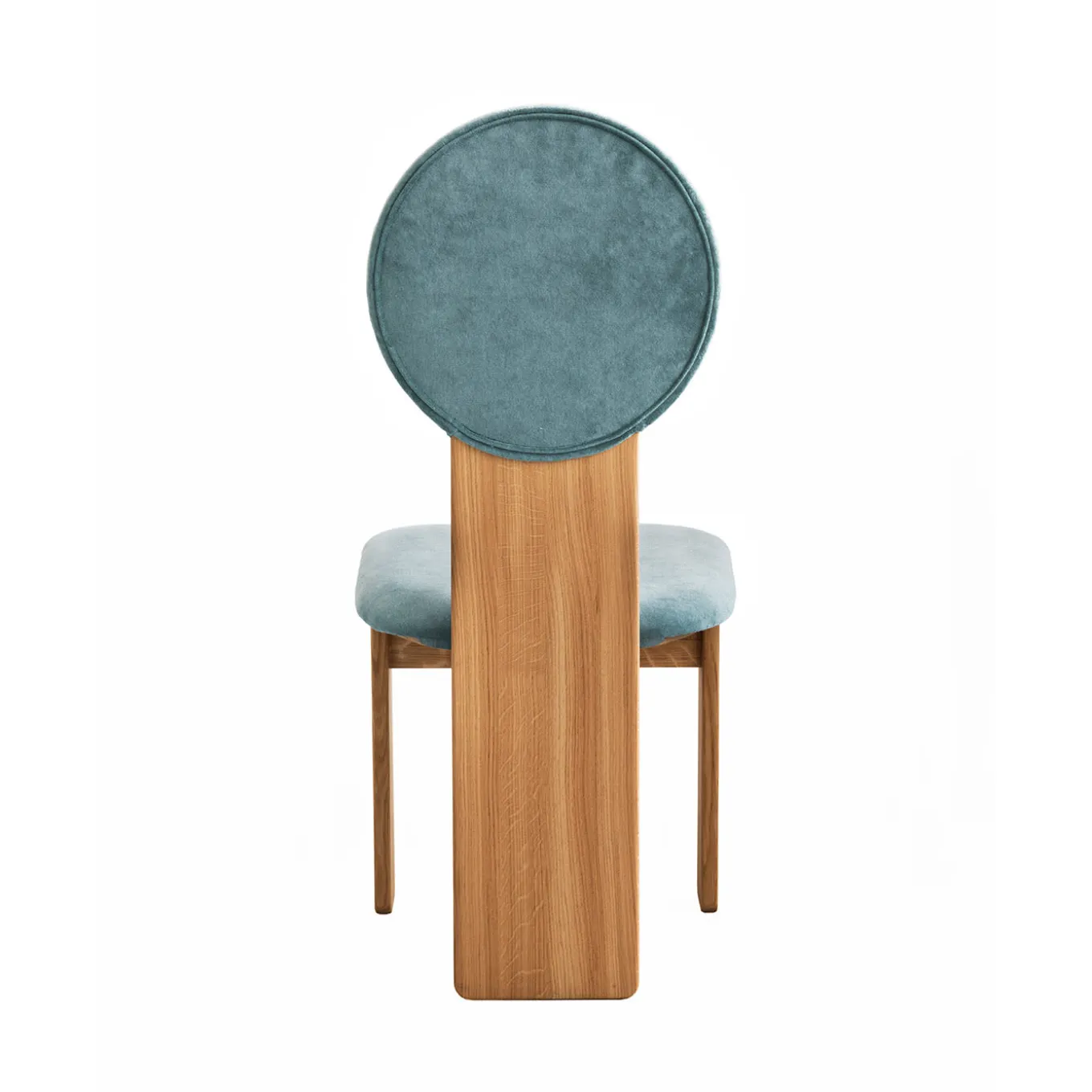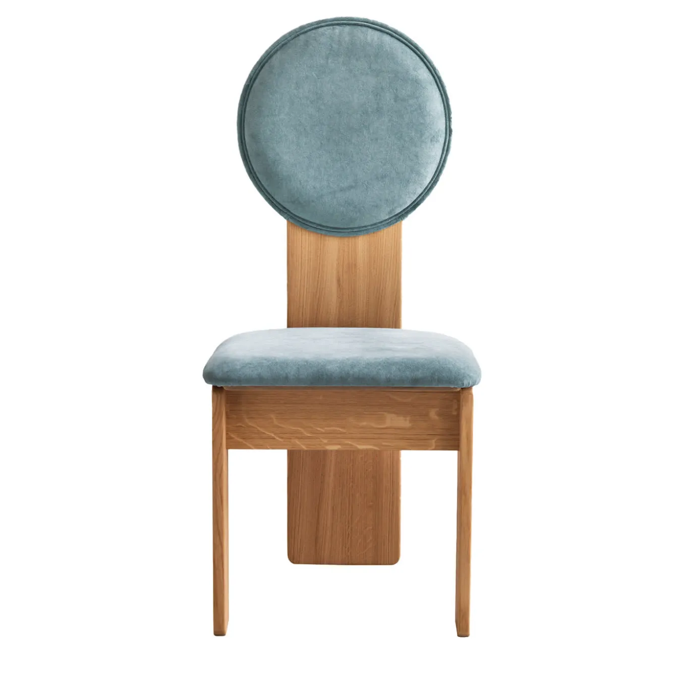 Sculptural dining chair in solid oak wood natural color upholstered in cotton velvet.